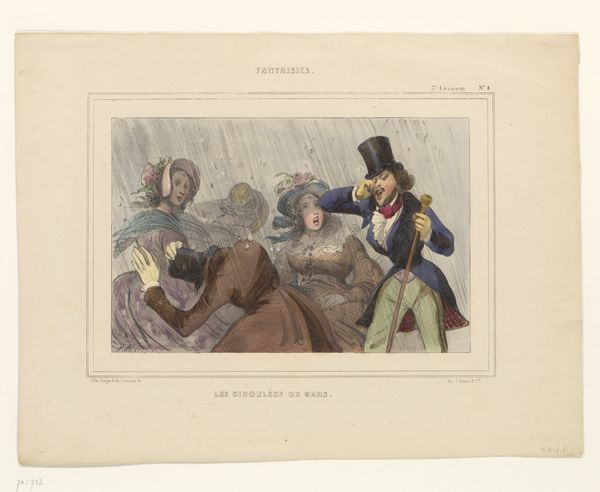 Curator: It’s organized chaos, isn't it? Utter mayhem rendered in a style that feels almost…delicate. Like a brutal opera acted out by porcelain dolls. Editor: Indeed! This piece, "Omnibus met passagiers wordt overvallen," translates to "Omnibus with Passengers being Assaulted," created by Joseph Ambroise Jobard sometime after 1826. What we have here is a watercolor illustration rendered with soft pastels on what appears to be aged paper. Jobard truly captured the most shocking and traumatic imagery, softening it so its impact is palatable and enjoyable. Curator: Palatable is one word for it! For me, it’s about the visual short-hand. Look at the praying figure – hands clasped, face contorted. It’s less a portrait and more a symbol of desperation, of bargaining with fate. You get all of the human emotions distilled into a kind of narrative code, almost! Editor: Precisely. And consider the iconography of the stagecoach itself. The stagecoach long held dual meaning. For some it meant social and economic ascension, but for others, especially those lower on the socioeconomic scale, the coach meant the widening of the gap as the wealthy took leave from them. See how it all begins to intertwine? The robbers in this scene may very well have deep symbolism representing resentment of class divides! Curator: Absolutely! I wonder though if part of its impact comes from this flattening effect of caricature? No one person stands out in sharp detail. They're all just shapes in the swirl. That sense of anonymity—of being another face in the crowd subject to random violence—is pretty disturbing. What do you make of this pastel color palette? Editor: The softness of color creates a sort of paradox. It makes the brutal scene feel less immediate, almost dreamlike, while subtly reinforcing themes. The light hues used here make it very difficult to focus our gaze on one focal point, a reminder of how the people present at this event may not remember who attacked them due to shock! Curator: That's very insightful. Ultimately, this image offers not only a glimpse into a historical event, but serves as an iconographic roadmap into the social consciousness and psychological space during that era. Editor: Indeed. "Omnibus met passagiers wordt overvallen" is both an artifact of its time, and a striking visual meditation on human behavior when things go terribly, terribly wrong.