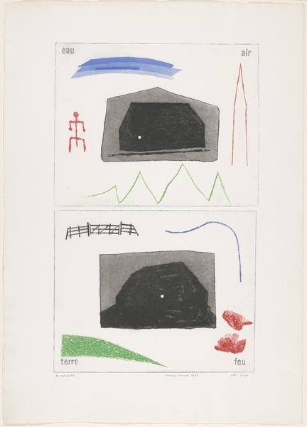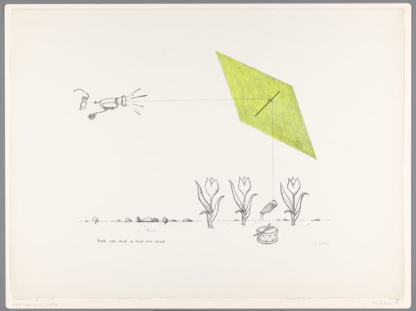Editor: We're looking at Harrie A. Gerritz’s “Landschap met paard” from 1950, an ink print on paper currently held at the Rijksmuseum. It strikes me as quite unusual; the composition feels very fragmented and almost dreamlike. How do you interpret this work? Curator: The key lies in its formal arrangement. Consider the spatial relationships – the way the artist has placed seemingly disparate elements within the picture plane. Note how the fragmented horse form is juxtaposed with the geometric shapes in the lower corner and the abstracted landscape in the center. It avoids illusionistic depth; everything is brought forward, emphasizing the two-dimensional surface. Do you see the grid-like structure underlying sections of the image? Editor: Yes, now that you point it out, it’s like a map or a blueprint. But why this kind of deliberate flattening? Curator: Gerritz, working in the Modernist period, rejects traditional representational modes. He seems to be interested in exploring the very essence of form and space. The drawing's medium itself—ink on paper—also reduces complexity to essential lines and shapes. Notice the careful arrangement of these elements, the subtle tonal variations of the ink; the print transforms a familiar subject, the landscape, into an exercise of structural and abstract pictorial elements. What do you make of that visual tension? Editor: I guess the artist wanted us to see a landscape, and the elements within it, in a completely new, stripped-down way, more as formal components than recognizable scenery. Curator: Precisely. It pushes the boundaries of representation itself, encouraging us to deconstruct how we perceive and interpret the world through art. Editor: This discussion has revealed complexities I didn't notice initially. The piece now appears as an invitation to consider art as an exploration of form. Curator: And how the formal properties determine meaning. I will carry this discussion with me too!
