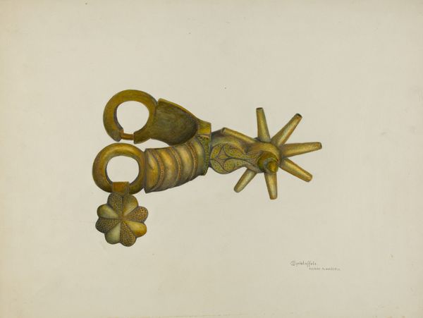 Editor: This is "Spur," a drawing made around 1940 by Harry Mann Waddell. It's a very detailed, realistic rendering, but the isolated composition gives it this strange sense of detached observation. What should viewers make of an image like this? Curator: It's intriguing how Waddell presents a functional object like a spur as an almost scientific specimen, devoid of context. Drawings like this, especially those created during this period, often speak volumes about prevailing cultural values. Consider the rise of museums during this era, emphasizing object classification and public education. How does this drawing participate in this public role of art? Editor: I see what you mean. The focus shifts from the rider or the horse to this single tool... Curator: Exactly. It elevates the everyday object. Waddell compels the viewer to scrutinize the design, the craftsmanship, even the potential impact. Does removing it from its context somehow change or enhance its meaning? How do you think its reception would differ in, say, a historical society versus an art museum? Editor: In a historical society, it might be examined for its specific design and use. Here, its more about its symbolism. It can prompt us to question the romanticized vision of the American West and consider ideas around control. Curator: Precisely. The politics of imagery are central here. It can serve as a lens through which we consider labor, animal rights, even Western expansion itself. Did anything surprise you about the artwork after our conversation? Editor: It’s become far more loaded than it initially seemed! I initially saw just a detailed drawing. Now, I understand the drawing as being placed in social and cultural dynamics and narratives. Thanks so much for your insights!