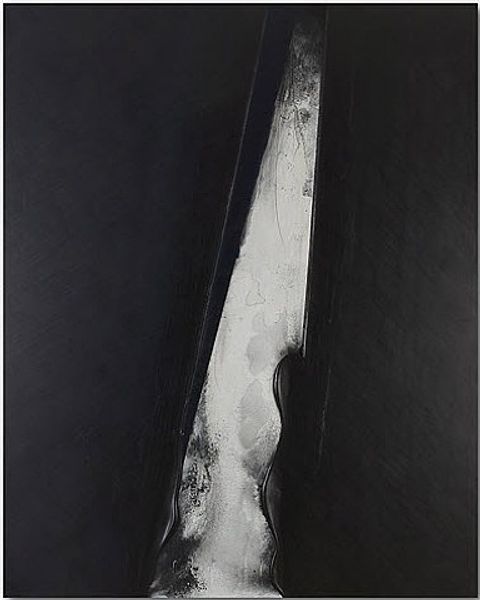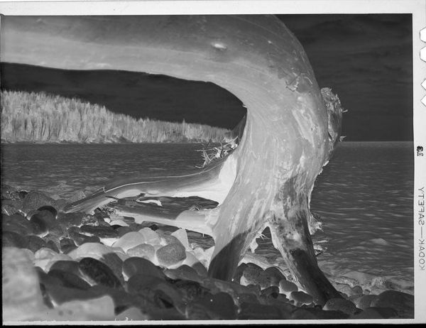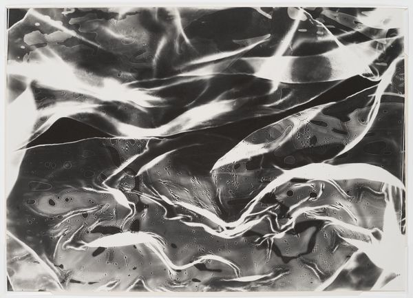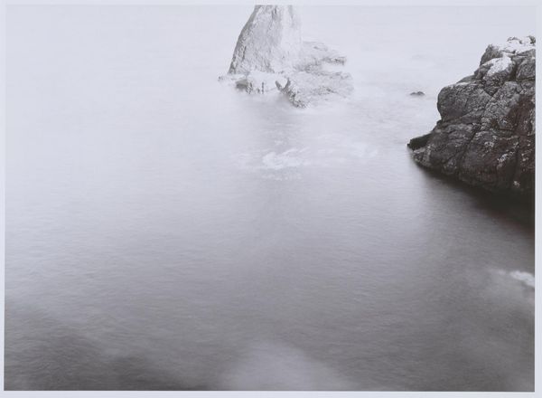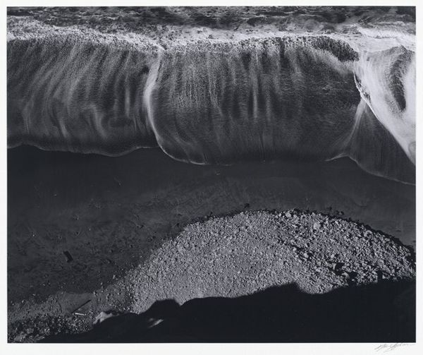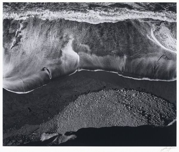 Curator: Welcome. We're looking at Ansel Adams’ "Surf Sequence 3, San Mateo County Coast, California." The date is a bit vague, listed as somewhere between 1940 and 1982. It's a gelatin silver print, part of his exploration of the California landscape. What strikes you initially about this particular photograph? Editor: My breath hitched, actually. From above, the restless sea looks almost...gentle, in a way, flowing sand that both collides with something rocky on the beach as much as embracing it in frothy blankets. It makes me think about stillness found even in constant motion. Curator: Adams often sought out these moments of dramatic beauty in nature. He saw photography as a way to reveal the underlying structures and patterns of the natural world. His focus wasn't just on documentation; he also cared about activism and advocating nature conservancy Editor: I see a constant tension here—smoothness and texture, light versus encroaching darkness, the ephemeral, restless waters against a solid mass. He frames an interesting debate about opposing things that co-exist simultaneously Curator: Exactly! The high contrast that he achieves emphasizes that tension you mentioned, but also echoes a tradition in photography known as pictorialism where a photographer employs strategies associated with painting and printmaking. This approach enabled him to craft rather than simply capture images. Editor: Hmm, this composition from a bird's-eye view gives the impression of some abstract topography in the photo's center. I wouldn't be able to grasp where I am in reality unless there were references. In any case, there aren't any visible subjects of interest that are obviously present. Do you think this was intentional or an unplanned composition? Curator: That sense of being suspended, outside the frame is part of it, I think. And yet, that horizon makes an appearance on its own as the place of some action in this landscape. Adams was incredibly deliberate, using meticulous darkroom techniques to achieve the tonal range and clarity he sought. Editor: It is very thought provoking how his lens found a pattern with light and shadow play, making every viewer wonder about what to expect within such complex scenery! And, despite not having color to define specific natural traits of objects, the image brings to the surface a hidden intensity only his talent could have ever conveyed! Curator: Absolutely. Looking at this photograph reminds me that we can see both grandeur and fragility in the coastal landscapes that we inhabit, and it reveals some hidden features too! Editor: Agreed! In essence, such image is like taking something ordinary and making people contemplate it so intensely that no one will ever perceive coastlines so passively. It's as simple as this—beauty isn't just an artistic process, it involves observation, sensitivity, talent... the Ansel Adams signature recipe.