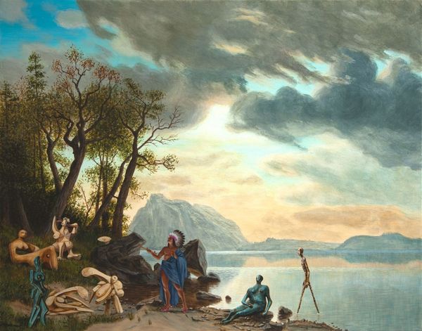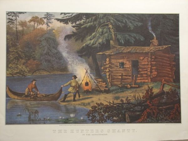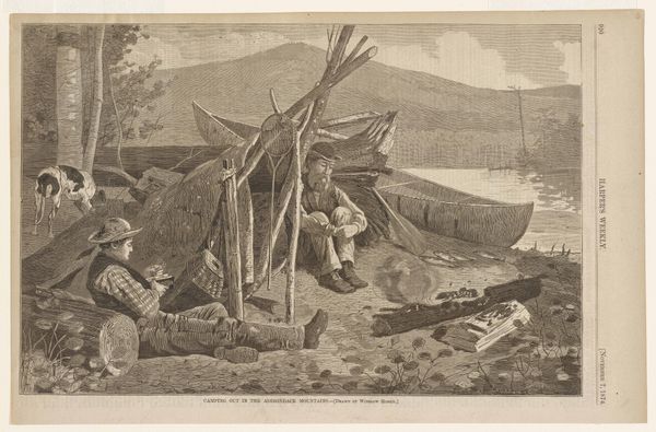 Editor: So, here we have *Hunting, Fishing and Forest Scenes* by Currier and Ives. It looks like a watercolor and strikes me as a scene of idyllic camaraderie, almost romantic in its depiction of leisure. What do you see in this piece? Curator: Well, first I'm struck by the way this image perpetuates a certain myth, a deliberate construction of American identity tied to the land. Consider the clothing of the figures, relatively refined against the backdrop of wilderness. How does that speak to the idea of taming nature, making it a place of recreation rather than survival? Editor: That's an interesting tension. They're clearly enjoying the fruits of the land, the fish, but their appearance doesn't quite align with being rugged outdoorsmen. It's more like a cultivated leisure. Curator: Precisely. This cultivated image then serves as a cultural touchstone. The symbols tell us about access and who had access at that time to these resources. Think of the forest, the fish, and the fire – potent symbols that carry with them historical and often complicated cultural baggage about settlement. Do you see any tension between their narrative and the landscape itself? Editor: It makes me think about whose stories are left out, and the environmental impact of these activities. I hadn’t considered the subtle symbolism within this picturesque scene before! Curator: Images like this reinforced a vision, perhaps an idealized one, of the American experience that certainly bears more complex scrutiny today. Recognizing how deeply those symbols resonated then—and even now—reveals how much power images truly hold. Editor: Absolutely! I now look at it in a completely different light. Thank you for your insights!