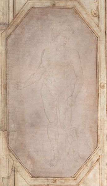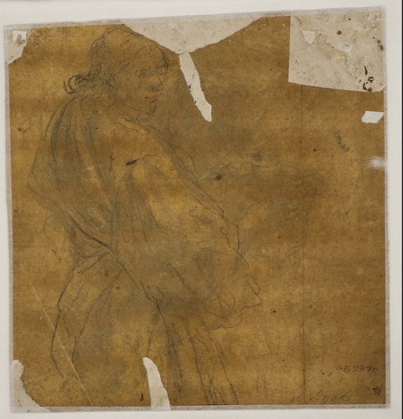 Editor: We’re looking at a drawing titled "Hercules," artist unknown, from an indeterminate date, held at the Art Institute of Chicago. It's rendered in chalk and charcoal on paper. It feels like a faded memory, this powerful figure sketched with such ephemeral materials. What stands out to you from a formalist perspective? Curator: The strength of this piece, I believe, lies in its careful arrangement of line and form. Observe how the artist uses chiaroscuro, the contrast between light and shadow, to define Hercules' muscular anatomy. The body, though faded, displays a deliberate curvature of lines that delineate his figure from the top of the head, down to the subtle torsion of the lower body, implying a sense of potential, yet contained energy. Editor: It's interesting how the damage to the paper almost enhances that feeling of ancient strength, something weathered but enduring. How does the composition contribute? Curator: Indeed. The cracks become part of its history. Consider the implied lines that direct the viewer's gaze. The angled positioning of the body relative to the frame generates a diagonal tension, countered by the relatively static background. This contrast creates visual interest, drawing us into the formal dynamism present even within this somewhat incomplete form. Editor: So, it's the interplay of these formal elements, line, shadow, composition, that create meaning, regardless of the subject's mythology? Curator: Precisely. While knowing it depicts Hercules adds another layer, the formal elements—the arrangement, contrast, and the visual weight—communicate power and resilience even without that knowledge. The semiotic possibilities generated by the formal aspects permit us to 'read' and interpret meaning in new, unforeseen ways. Editor: That’s fascinating. I appreciate learning how to detach the subject matter from the visual components in this way. Curator: Indeed. Seeing this allows us to build stronger relationships between the art object, theory and philosophy to decode artworks using their raw formal attributes.