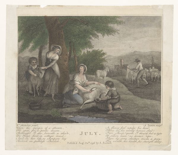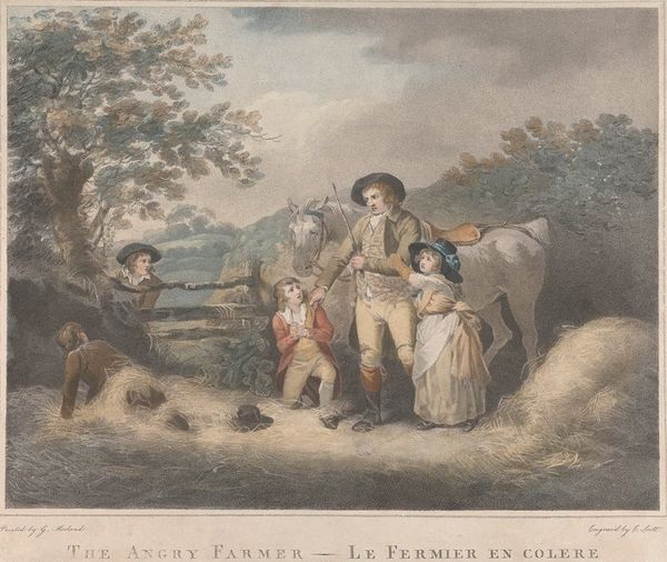 Editor: Here we have "The Family of Sir James Hunter Blair, 1st Baronet", created between 1780 and 1790 by David Allan. It's a watercolor, pencil, and colored pencil drawing, quite a large group portrait. I'm struck by how staged it feels, but at the same time, it's portraying this supposed leisurely family outing. What do you see in it? Curator: It's a fascinating image, isn’t it? Allan positions the family within a burgeoning culture of sensibility and nascent ideas about childhood. Look at how they interact with the landscape. The family isn’t just *in* nature; they’re performing a relationship *with* nature, and with each other, for the viewer. Note how everyone's included, the adult, the children and even an enslaved child being dragged down, and being forced to play along, can you image the power dynamics involved. Editor: That's a great point about performance. And I didn't even notice the enslaved child! The composition does seem to almost carefully arrange them like props, rather than depicting spontaneous family fun. What do you think the presence of such an uncomfortable detail adds? Curator: Exactly! By inserting the horrors of colonialism into an upper class family portrait, Allan turns a record of accomplishment into an active document of society’s ill-doings and injustices. I think Allan aims to use portraiture as a means to bring attention to the ethics of upper-class complacency. It shows the families active role in perpetuating said colonialism. Editor: Wow, I hadn't considered all of that. It really shifts my understanding of the piece from a simple portrait to something much more critical of its time. Curator: Precisely. It highlights how artistic patronage and production were often intertwined with the complex socio-political and economic structures of the time. These images, seemingly benign, actively helped define these figures and the socio-political structures supporting them, too. I have learnt a lot from your observation also. Editor: Well, I've certainly learned a lot today!