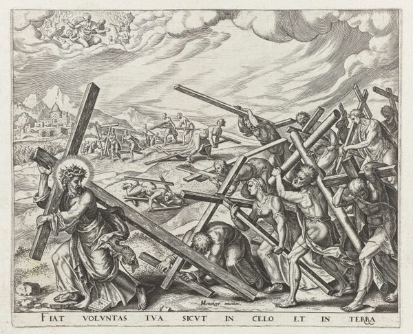 Curator: This piece, "Christ Bearing the Cross," is an anonymous work, rendered with stark detail. It depicts a critical moment within Christian theology. Editor: My first impression is one of intense, almost overwhelming movement. All the figures are rendered so dynamically; the overall effect is quite chaotic. Curator: The chaotic nature really underscores the social dynamics at play. The jeering crowd, the Roman soldiers, all complicit in this systemic violence. Editor: Absolutely. The weight of the cross is not just physical, but symbolic. The sheer number of figures, the way they’re positioned – it’s a visual representation of collective guilt and the abuse of power. Curator: The artist’s choice to remain anonymous is also compelling, perhaps gesturing towards the shared burden of that historical moment. Editor: The image is a powerful meditation on suffering, and the symbols carry their weight through time, as relevant today as they were then. Curator: Indeed. It challenges us to consider our own complicity in systems of oppression. Editor: Precisely, a testament to the artist’s skill in capturing the essence of a timeless tragedy.