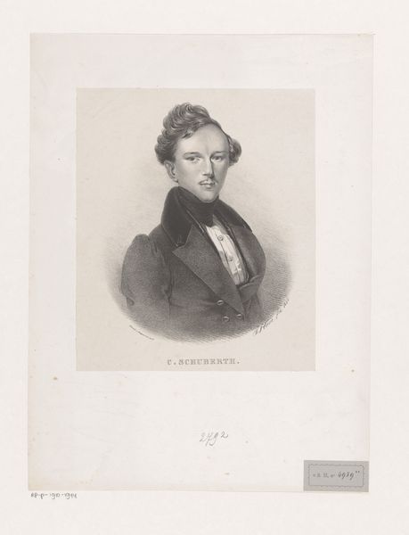 Editor: This is "Portret van Hendrik Jozef Franciscus van der Poorten," a pencil drawing made in 1822 by Guillaume Philidor Van den Burggraaff. The softness of the pencil gives it an ethereal quality, almost like he's emerging from a mist. What compositional elements stand out to you in this piece? Curator: The success of this portrait lies significantly in its manipulation of light and shadow, or chiaroscuro. Notice how the artist uses varying pressure on the pencil to create a tonal range that defines the subject’s form. The subtle gradations around the face, for instance, give it volume and a sense of depth, whilst the darker areas suggest the placement of the light source. Editor: That’s fascinating. So you’re saying that without color, the artist relies purely on value to create form? Curator: Precisely. Observe the way the light catches the high points – the forehead, the cheekbones, the ruffled collar – and how that light gradually falls into shadow. This use of value not only models the form but also imbues the portrait with a certain drama. Moreover, the hatching and cross-hatching techniques evident in the rendering of the coat add texture and further depth. The density and directionality of the marks construct a compelling visual rhythm. How does the interplay between these textural variations affect your perception of the subject? Editor: I see what you mean. The rough texture of the coat really contrasts with the smoothness of his face, almost like a contrast between his internal thoughts and the external persona he shows to the world. The artist uses different strokes to portray different sides of the person! Curator: Exactly. It's in the details of these deliberate textural differences that the work obtains such strength, even as the colour pallette remains limited. I am happy to see you are beginning to engage in this painting's artistic composition. Editor: Thank you. I've definitely learned a lot by simply observing the artistic makeup.
