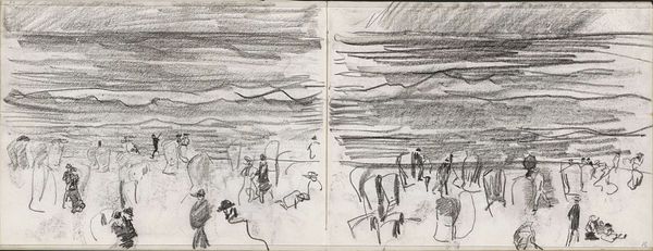 Isaac Israels created this sketch titled 'Figures on the Beach', now held at the Rijksmuseum. The drawing, rendered in rapid strokes of graphite, presents a fleeting impression of people and dogs at the seashore. Israels's sketch embodies a certain artistic freedom. The figures, though identifiable, are not meticulously detailed. Instead, the artist captures the essence of their forms and movements with an economy of line. Note how the composition focuses on the interplay between the figures and the open space of the beach. The horizon line sits high, compressing the scene and emphasizing the figures' relationship to one another. The brisk lines and spatial dynamics within the sketch reflect a modernist sensibility. Israels isn't simply representing a scene; he's exploring the very act of seeing and representing, challenging traditional notions of form. This piece invites us to consider how art engages with the world and transforms it through the artist's unique perspective.