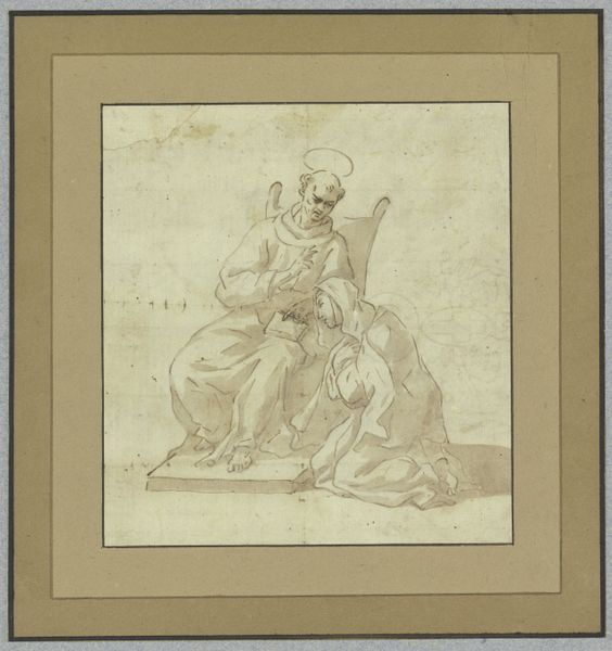 Curator: This drawing, dating from about 1590 to 1600, is titled "Study for a Figure of Saint Joseph" by Bartolomeo Schedoni. It's rendered in dry media, quite likely black chalk. Editor: It strikes me as a pensive study. There’s a weariness etched into the lines, especially around the eyes and the set of the shoulders. It feels intimate, like we're observing a moment of private contemplation. Curator: Indeed. Consider how Schedoni uses hatching and shading to define the planes of the figure. See how the light catches the folds of the drapery and models the form beneath? It's a masterful use of chiaroscuro for such a preliminary work. Editor: I’m immediately drawn to the almost symbolic weight of the objects in Joseph’s hands – the tools of his trade as a carpenter, emblems of labor and provision. Note how Joseph's likeness projects strength, despite the emotional vulnerability that defines his expression here. There's an earthy, paternal dignity in the way he’s depicted. Curator: From a formalist perspective, I’m intrigued by the economy of line. Schedoni achieves a remarkable sense of volume and texture with a minimum of strokes. The composition is also carefully balanced, guiding the eye through the figure's posture and gesture. Editor: And those gestures speak volumes, don't they? They suggest a story, hinting at Joseph's role as protector and provider. This image builds upon the archetypal depiction of Joseph as an ordinary, hardworking man thrust into extraordinary circumstances. I can see how Schedoni attempts to ennoble those seemingly ‘common’ associations here. Curator: Ultimately, it’s a beautiful example of academic art, refined through preparatory sketches. The essence of Italian Renaissance ideals is still very clear here. Editor: This is far more than just a figure study. The emotional power within its deceptively simple lines offers lasting reflections on devotion, resilience, and faith.