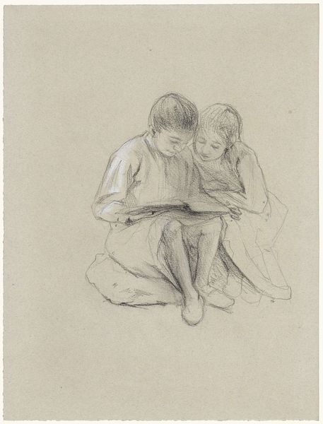 Editor: This drawing, circa 1790, is by Thomas Barker and is aptly named "Two Girls Playing on Combs". It’s charcoal and pencil on paper. There’s something very intimate and unassuming about it...almost like capturing a stolen moment. What jumps out at you? Curator: A stolen moment, yes, perfectly put! What intrigues me is how Barker uses such humble materials – charcoal and pencil – to capture something so fleeting and universally human. It’s as if he’s not just depicting two girls, but also a feeling, an essence of childhood play. It makes me think about the sounds of my own childhood and those little moments that somehow stay with you. What do you suppose their little melody might have sounded like? Editor: Oh, that's such a great question! Probably off-key, and joyous! Thinking about it, do you think the medium of charcoal lends itself well to this subject matter? Curator: Absolutely. The smudgy, almost dreamlike quality of charcoal softens the lines and imbues the scene with a sense of nostalgia. It’s less about precision and more about capturing an overall atmosphere, wouldn’t you say? Plus, there's that fantastic contrast between light and shadow that really emphasizes their playful energy. It almost vibrates, doesn’t it? Editor: Yes, absolutely. I'm seeing so much more in it now – not just girls playing, but a whole world of childhood wonder. I'll never look at a simple charcoal sketch the same way. Curator: Exactly! That’s the magic of art, isn’t it? Transforming the ordinary into something truly extraordinary. I hope people will come away thinking, "what humble object can I transform into joy today?”