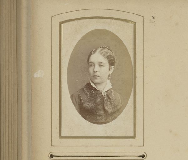 Curator: Here we have a portrait photograph entitled "Portret van een vrouw met halsketting," dating to somewhere between 1860 and 1900, by Julius Halffter. Editor: The soft sepia tone and the subject's composed expression give the image a certain gravitas. There is a feeling of solemn dignity. Curator: Photography at this time was far from instantaneous; it required elaborate preparation and a commitment on the part of both the photographer and sitter. We are really looking at the results of considerable collaborative labor. The creation of each photographic print demanded skill and patience, both valuable attributes. Editor: Absolutely, and labor shaped by its own specific constraints of gender and class! One imagines this woman positioned within a social landscape where her representation had real implications – who commissioned the portrait, and for what purpose? Is this for marital prospects, to present the family with honor and pride, to secure inheritance? The necklace reads of the material, and the portrait of its performative dimensions of bourgeois selfhood. Curator: Note, too, the presentation – the oval matte around the photograph, the inscription just below, likely identifying the sitter. Consider this object as it circulated: perhaps mounted within a family album, passed among relatives, carried across geographical divides. What stories of the image-making itself might be recovered to learn about materials that are no longer considered valuable, labor not seen as specialized, and an artistry that is still relevant. Editor: That focus on circulation is critical. What new resonances does this image gather when viewed through a contemporary lens? Does it speak to ideals of beauty or identity that resonate still? In my view, reflecting upon this allows us to reassess not only the values of the past, but those implicit in how we engage with such representations today. It urges us to reckon with questions of agency, representation, and the subtle negotiations between individual self-expression and broader societal norms. Curator: Well, looking closer, I think it serves as a testament to a collaborative artistry from which to draw broader socio-economic histories that we can engage with and share today. Editor: I find I'm now curious about who she was, beyond her societal representation. How her life intersected with those turbulent historical moments. It certainly makes me want to investigate more.