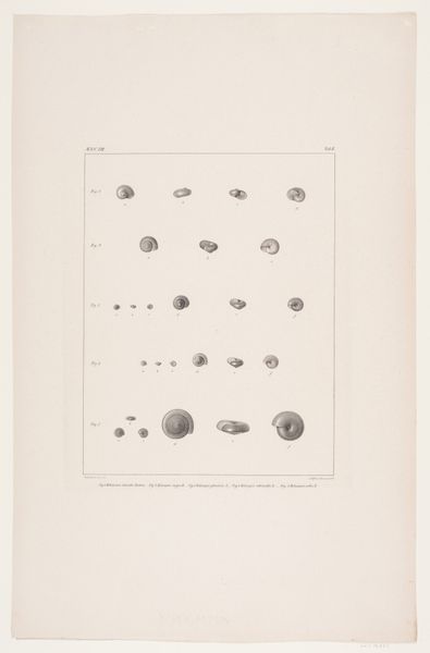 Carl Christian Larsen Cordts made this natural history drawing with pencil and lithography. The ordered display and the highly descriptive caption situate this image within the late 19th century Danish culture of scientific exploration and documentation. Made at a time of emerging national museums and universities, the image reflects Denmark's investment in cataloging its natural resources. Cordts’s lithograph contributes to the broader European project of classifying the natural world for scientific study and colonial exploitation. The meticulous rendering of each brachiopod fossil and the inclusion of precise measurements testify to a commitment to objectivity and empirical observation, values that were highly prized in scientific circles at the time. The image reinforces the authority of scientific institutions and experts in shaping our understanding of the natural world. It also raises questions about the relationship between scientific knowledge, national identity, and the exploitation of natural resources in 19th-century Denmark. By consulting museum archives, scientific publications, and historical records, we can gain a deeper understanding of the social and institutional contexts that shaped this work.