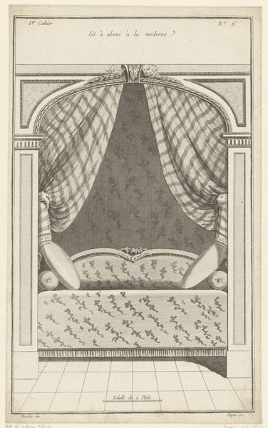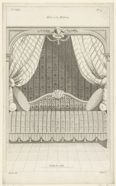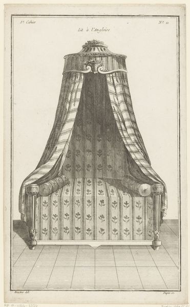 Curator: This is a fascinating print from the Rijksmuseum, "Hemelbed met medaillon," dating back to 1772-1779 and crafted by Nicolas Dupin. What strikes you first? Editor: Its linearity, certainly. The clear geometric shapes and the precision of line create an undeniably clean, almost austere aesthetic. The composition is highly ordered, with the lines and shapes creating visual balance. Curator: And those lines also indicate material; the engraving on this print captures a vision of textile design. Think about the labor involved in creating the luxurious textiles depicted. How was textile production organized in this period? Who had access to such luxury? Editor: An interesting proposition! And while I appreciate the question, my focus rests on form. The draped fabric above the bed is fascinating. Note how Dupin renders the fall of the material, giving it shape through delicate shading, and contrast. It almost defies the two-dimensionality of the print medium. Curator: I can see that. But consider the medallion: that's more than ornamentation, but an aspirational symbol connected to an elite class, consumption, status, and potentially political alliances of that class! And let's not forget how printmaking, while skilled labor, also helped disseminate new aesthetic styles, influencing wider markets and consumer desires. Editor: A valid point. However, stripping away those contextual layers, we’re left with this object, the clean line-work, the pattern, a testament to proportion and visual harmony that really strikes the viewer and draws the eye into a sense of comfort. Curator: But Dupin didn’t conjure this from thin air. The formal elements themselves become signs of material aspiration and social power of its time, if we simply choose to dig a little bit deeper. Editor: I suppose in the end the question rests upon how one understands value itself. Is value located in the experiential qualities of the aesthetic object, or in the socio-economic network in which the design emerged and was consumed? Perhaps there is space for both. Curator: Indeed! A productive dialogue bridging the intricate elements within the engraving to larger social currents reveals far more, no?