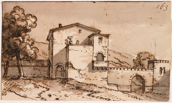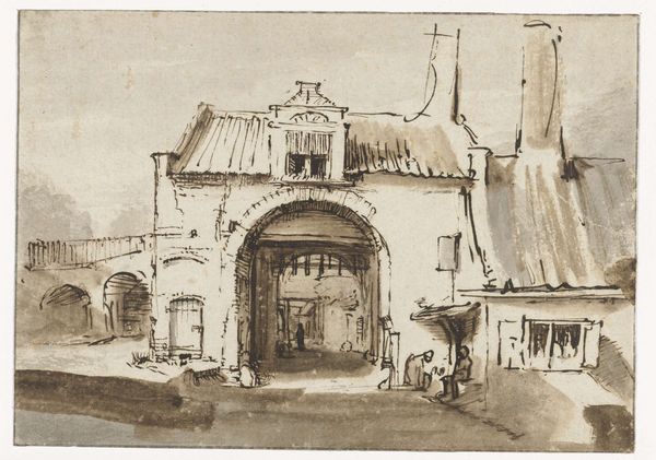 Editor: Here we have Wilhelm Marstrand's "Romersk gård med springvand," or "Roman courtyard with fountain," created in 1837 using pencil and ink. I'm struck by the quiet stillness of this scene; the fountain isn't flowing, and the figures are seated, almost as if posing. What jumps out at you when you look at this piece? Curator: It's interesting you note the stillness. For me, it immediately places this work within the artistic climate of the 19th century, specifically the appropriation of antiquity that was central to the Romantic project. Consider the public role Marstrand intended. What kind of idealised vision of Rome do you think he’s constructing here for a Danish audience? Editor: That's a great question. It feels almost like a stage set, carefully arranged to evoke a romanticized past. Maybe to remind viewers of an imagined simpler and more dignified life? Curator: Precisely! Think about the deliberate staging, the classicizing architecture, and the inclusion of those figures. Are they everyday Romans or types borrowed from art history? How does this image participate in constructing a certain vision of cultural heritage? Marstrand wasn’t just depicting what he saw; he was actively shaping a narrative. The very act of depicting this “Roman courtyard” is a claim about Denmark’s cultural relationship to its European heritage. Editor: So, he’s using Rome as a mirror to reflect on Danish identity and values? I hadn’t thought about it that way. The drawing, with its seemingly objective representation, is actually a very loaded statement. Curator: Absolutely. Art isn’t created in a vacuum; it’s always in dialogue with its socio-political environment. And in this case, that dialogue involves national identity and the political uses of art history itself. Editor: It's fascinating how much more there is to unpack when you consider the broader context. I’ll definitely look at art with a more critical eye from now on. Curator: That’s exactly what I hoped you’d take away from this. Keep questioning, keep connecting the art to its world, and you’ll always find something new.