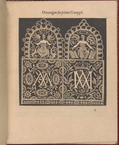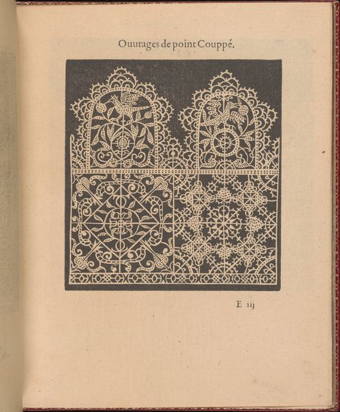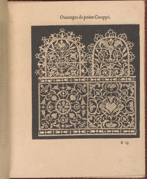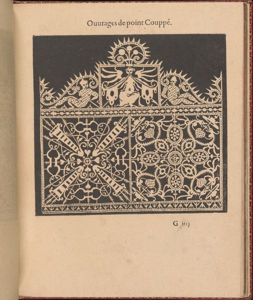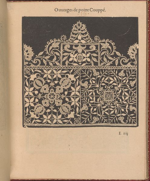 This is an instructional engraving, made in the late 16th century by Federico de Vinciolo. It illustrates needle lace patterns, or *point coupé*, using line and hatching. The design's impact relies on the precise, repetitive work involved in lace making, reflecting the period’s labor-intensive luxury goods production. The stark contrast between the black background and white pattern emphasizes the intricate, hand-executed details. The image displays a rich decorative vocabulary with stylized figures, leaves, and geometric shapes, and conveys the dense texture of needle lace. The engraving shows the techniques needed to produce luxury goods, connecting it to broader issues of labor, skill, and the rising demand for fashionable textiles in the Renaissance. Lace making was painstaking, but also offered economic opportunities, especially for women. By elevating a craft like lace making through detailed visual instruction, Vinciolo bridges the gap between art, craft, and the socioeconomic realities of his time.