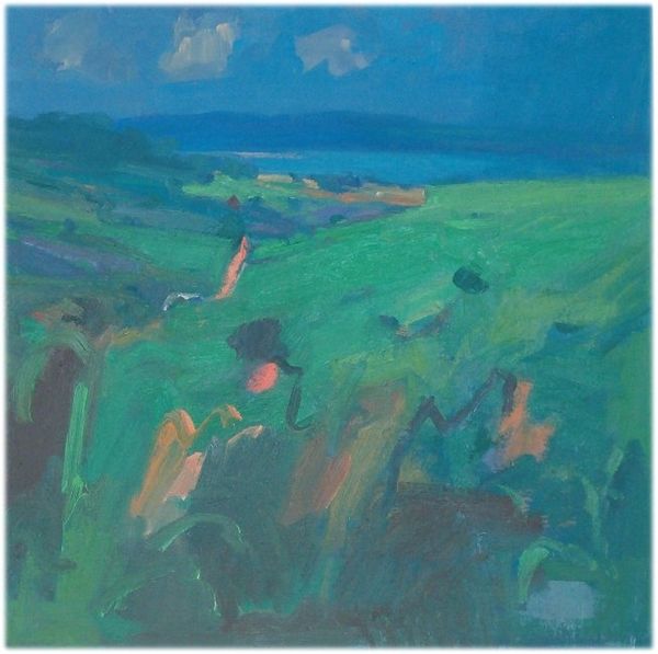 Editor: This watercolor is called "Mountain in New Hampshire" painted by O. Louis Guglielmi in 1932. I’m immediately struck by how the vibrant blues and greens feel almost dreamlike. What do you see in this piece? Curator: I see a careful construction of symbols, and I am immediately drawn to how the sun, depicted almost as a radiant halo, gazes upon this seemingly simple landscape. The mountain, rendered in intense blues, could be interpreted not just as a geographical feature, but as a symbol of resilience and endurance. Do you see any other potential symbols? Editor: I notice the small houses nestled at the base of the landscape, looking very pastoral and peaceful. Perhaps they symbolize community or refuge? Curator: Precisely. Consider also that Guglielmi painted this during the Great Depression. The presence of these humble dwellings speaks volumes about humanity’s persistent search for stability. Notice how these colors repeat, which can underscore both contrast and cultural continuity across time. Is there a visual dialogue that is revealed when certain forms repeat? Editor: That's fascinating. I hadn't thought about the painting in terms of what it tells us about a community's hopes and experiences during a difficult period. It makes the artwork feel much more layered and meaningful. Curator: Every landscape is more than it appears. These mountains speak volumes about who we were, and perhaps who we hope to become, which we often recognize by connecting to what we recognize through inherited symbolism. Editor: I’ve never really considered symbolism in landscapes, but now I'm seeing it everywhere in this work! It's really broadened my perspective. Curator: Art helps us excavate cultural memories and see things in fresh, and ever changing, ways.