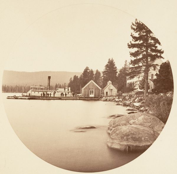 Curator: Here we have a view of Yosemite National Park, taken sometime between 1876 and 1880 by Carleton Watkins. What’s striking to me is how utterly timeless it feels, an enduring American icon captured in a single frame. Editor: My initial reaction is one of serene stillness, almost meditative. The monochromatic tones and circular format create a sense of contained observation, like peering through a porthole into a pristine world. It's both intimate and grand at once, an invitation. Curator: Absolutely. And that's the genius of Watkins. Working with a large-format camera and albumen prints, he managed to convey the monumental scale of Yosemite. But there is also incredible detail - look at the textures of the bark, the reflection on the water. He invites contemplation. I'd even argue this belongs to the Hudson River School style because it makes an appeal to a landscape with allegorical potential. Editor: You're spot on. This is an albumen print and, to me, that imbues it with even more symbolic weight. This process emphasizes the symbolic significance of the sun and, in this image, how it both veils and illuminates the peaks of the Yosemite Valley. This valley emerges as an earthly paradise of untapped potential, inviting people Westward towards what was then America’s El Dorado. Curator: Do you think there is any significance to that figure on the horizon of the river bank, and what could that symbolize, if anything? Editor: Interesting thought. The image doesn't make it clear, but, the people standing there are tiny amidst that backdrop, emphasizing humankind's transient presence alongside enduring natural splendor, but maybe that human is also Watkins himself! It highlights the complex relationship between nature and society during a period of westward expansion and conservation efforts. We get to witness both nature's bounty and the responsibility it places on the citizens of the young Republic. Curator: Right. The image reflects the evolving dialogue around environmentalism, too. Editor: Ultimately, for me, it evokes that fundamental question we ask: what’s our place within this vast and intricate world? The album print isn't just a beautiful photograph but a mirror, a symbol, inviting us to reflect upon ourselves as a nation. Curator: Well, on that note, it's easy to understand how, to this day, the majestic landscape and artistic renditions continue to fuel the environmental awareness.