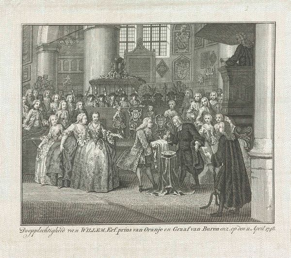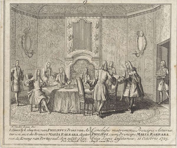 Curator: Today we are looking at "The States General Signing the Treaty of Hanover, 1726," an engraving made around 1726-1727 by Leonard Schenk, now held at the Rijksmuseum. Editor: The detail is astounding, like peering through a keyhole into another world. The crosshatching creates a compelling range of darks and lights. Curator: Yes, Schenk masterfully employs the engraving technique to depict this pivotal historical moment. The signing of the Treaty was a key event in the shifting European alliances of the 18th century, positioning the Dutch Republic alongside Britain and France. Editor: Considering the context of printmaking during that time, what kind of labor went into producing multiples of an image like this? Each line is so meticulously etched! It speaks volumes about craft and the means of circulating information in that era. Curator: Exactly. Prints like these served a vital public role. They offered visual documentation and propagated specific narratives, influencing public perception of political events. The distribution of these images also played a role in reinforcing and publicizing political ideologies. Editor: It is curious how formal it feels: everyone in fancy garments, surrounding themselves in heavy drapes and grand interior decorations. Does this tell us that only the elite have access to this level of treaty negotiations? Curator: Most likely. The grand setting of course suggests the importance and solemnity of the occasion. It also projects power and authority. These prints allowed wider audiences a peek into the halls of power, shaping ideas about government, policy, and decision making. Editor: It feels weighty somehow—both in terms of the scene depicted and the physical act of creating it. The materiality and density of information present is so tangible! Curator: Indeed. Understanding the context of its creation helps us read into the historical role this image played. Editor: Looking at the materials and craftsmanship deepens my appreciation for this kind of political history. It's all woven into that etched line.
