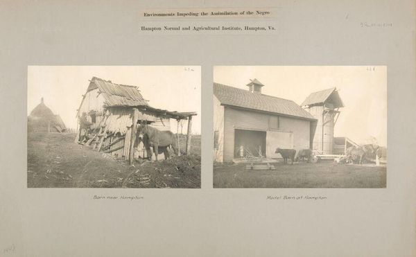 Curator: This photographic print by Frances Benjamin Johnston presents a diptych of domestic spaces. It's titled "Races, Negroes: United States. Virginia. Hampton. Hampton Normal and Industrial School: Environments Impeding the Assimilation of the Negro." The photos were taken near the Hampton Normal and Agricultural Institute. Editor: The stark contrast between the images is immediately striking. On one side, a worn, rustic cabin; on the other, a neat, two-story house. It feels like a visual argument. Curator: Indeed. Johnston’s photographs were often used to promote or critique social policies. Here, the juxtaposition subtly argues for the civilizing influence of institutions like Hampton, contrasting it against what she frames as hindering environments. Editor: The loaded title reveals so much. It positions assimilation as the desired outcome while framing certain environments, presumably those associated with Black communities, as "impeding" progress. It's a clear power dynamic at play. Curator: Precisely. It reflects the complex and often contradictory goals of industrial schools like Hampton, which aimed to educate Black students while simultaneously reinforcing existing social hierarchies. Editor: Examining the images critically, we see how photography was wielded as a tool to support specific narratives—narratives that need challenging and re-contextualizing today. Curator: Absolutely. Johnston's work, while visually compelling, needs to be understood within the historical framework of racial inequality and the politics of representation.