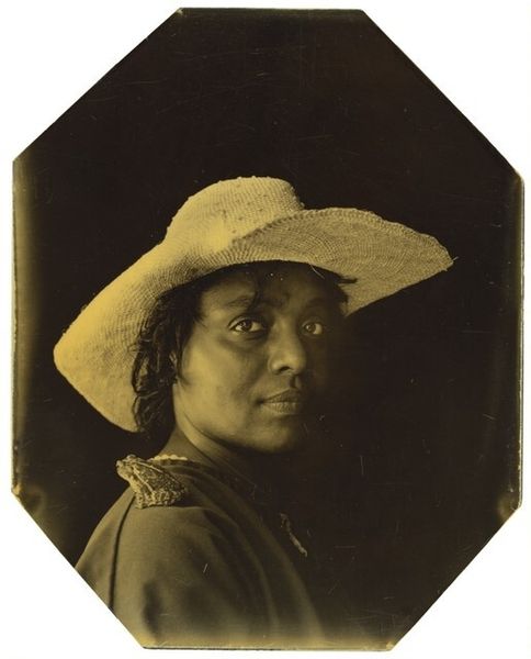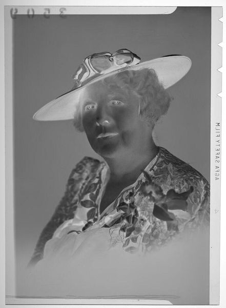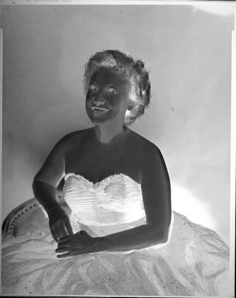 Curator: This intriguing photographic negative, a studio portrait by Martin Schweig, presents a woman in a dress with distinctive ties on the collar. Editor: My initial impression is one of spectral elegance. The inverted tones create a sense of mystery, a haunting beauty. Curator: It’s fascinating how these reversed tones shift our perception. The dress, with its tied collar, speaks to a certain era and its conventions of femininity, perhaps even hinting at constraints. Editor: Absolutely. The ties themselves could be interpreted as symbols of connection, but also of control. Note, too, the necklace—a possible indicator of status, a visual marker of identity and belonging. Curator: Considering the period, studio portraits were often carefully constructed performances. We must question the agency of the sitter. How much did she actively participate in the creation of this image? Editor: That’s a critical point. The averted gaze, the careful pose, all contribute to a narrative we can only partially decipher. There is a quiet power here, though, defying the limitations of the medium and the era. Curator: Indeed, it’s a dialogue between self-expression and societal expectation. I find this image speaks to the enduring complexity of female representation. Editor: And for me, it’s the enduring power of symbols to convey meaning across time, inviting us to connect with a woman we can never truly know, yet somehow recognize.