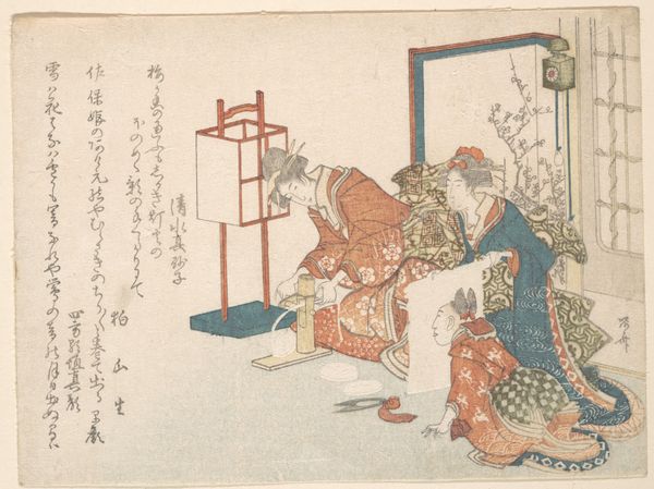 Yashima Gakutei created this woodblock print, "Nobleman and Warrior," sometime between the late 18th and mid-19th century. It offers us a glimpse into the complex social hierarchies of feudal Japan. We see a nobleman, impeccably dressed, standing over a fallen warrior who lies prone, still clad in armor. The warrior’s helmet sits discarded on the floor, a stark symbol of defeat. This image isn’t just about a singular defeat; it speaks to the very rigid class structures that defined the era, with the nobility holding dominion over even the most valiant of warriors. The print invites contemplation on the themes of power, submission, and the human cost of social stratification. It’s a snapshot of a world where identity was inextricably linked to one's position in the social hierarchy.