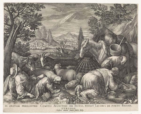 Curator: Let’s examine "Het verbranden van het onkruid en oogsten van het graan," or "The burning of weeds and harvesting of grain." This engraving, created between 1585 and 1700 by an anonymous artist, comes to us from the Rijksmuseum. Editor: The stark contrast in values immediately grabs you. There is such busyness! A dynamic, almost feverish quality across the scene... Are we looking at toil or trouble? Curator: It's important to place this print within its socio-political context. Agrarian life held significant symbolic weight, representing the cyclical nature of life, labor, and divine providence. How might anxieties about scarcity and societal order have influenced this imagery? Editor: I'm also struck by the central figure; there's a definite power dynamic established with their pose and attire. But also consider the simultaneous acts depicted - burning the weeds and gathering grain - a fascinating juxtaposition of destruction and nourishment occurring side by side. Who gets to decide what is deemed 'weed' and what is grain, and based on whose criteria? Curator: The landscape genre becomes a loaded space here. Look closely at how the artist represents the laborers: Do we see the dignified representation of the common worker, or is there an emphasis on their submission within a social hierarchy? Are we invited to sympathize or judge? Editor: I think we need to look beyond simplistic class readings to appreciate the complexities. Consider the visual language here; the artist positions this agricultural scene in what feels like an idealized past while quietly showing the imbalances of power inherent to land ownership and labour. Curator: Certainly. The ambiguity of its themes invites reflection on who benefits from narratives surrounding rural labour and idealized countryside. The act of "harvesting the grain" speaks to very modern and ongoing questions around worker's rights. Editor: It becomes, for me, less of a static scene and more of a commentary on ever-evolving socio-economic structures through symbolic visual cues. Curator: Exactly, engaging with "The burning of weeds and harvesting of grain" invites deeper engagement with themes that persist. Editor: An engaging prompt to reflect on agriculture's social, ethical, and economic frameworks.