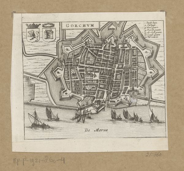 Curator: Here we have an engraving titled "Plattegrond van Arras," a cityscape rendering that, based on the Rijksmuseum records, dates sometime between 1652 and 1662. It's quite meticulously rendered, isn’t it? Editor: It's strikingly ordered, almost serene from this remove. Though, knowing the history of that era, it speaks to a very particular socio-political need for control and defense. The fortifications are the most prominent visual element. Curator: Absolutely. The symbolic weight of walled cities is immense. They are protective wombs, promising safety but also enforcing limitations. You see the two coats-of-arms? Notice how they are perched over the city almost like protective deities. Editor: Yes, they definitely visually assert power and authority. These weren't neutral records; these plans served strategic and propagandistic functions. Each building is carefully delineated; one can almost imagine the controlling power meticulously surveying their domain. Curator: Precisely! The walled garden city itself as an iconographic form. Consider how the river is utilized to both sustain and defend the city; life and boundary intertwine in the visual vocabulary of this image. Editor: And the tiny figures outside the walls? Their vulnerability is palpable in comparison to the seeming impenetrability of the city itself. It's a powerful visual hierarchy at play. Curator: I’d say that cartography, at this stage, still holds elements of subjective visual narrative, it blends utility with ideology. A statement about how a community conceptualizes itself. Editor: I agree. It also raises interesting questions about who was the intended audience and what role such images played in shaping their understanding of power, territory and community. Curator: Looking closer helps us reconsider the visual impact of something we think we already understand. Editor: Indeed. The more one contemplates this ostensibly neutral record, the more subjective intention emerges.