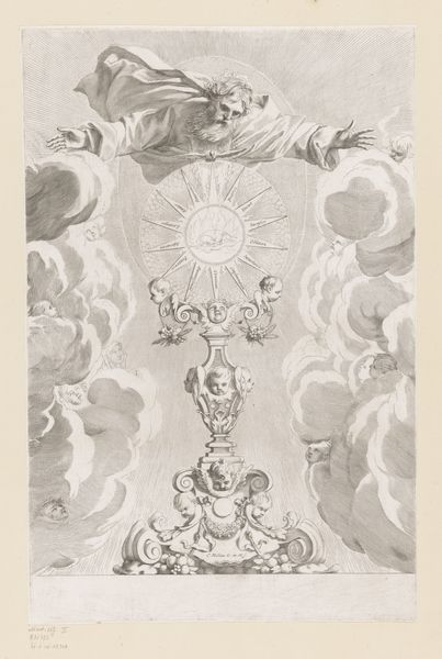 Editor: This is "Planeet aarde en God," or "Planet Earth and God," a 1733 engraving by Johann Georg Pintz, currently held in the Rijksmuseum. It’s an ornate piece, quite striking really. There's a globe encircled by clouds, and bathed in divine light. What layers of meaning do you find embedded in it? Curator: I see a potent visual statement reflective of its historical context. This image emerges from a period of intense philosophical and scientific shifts. Pintz places “God” as a powerful force, but note how that divine power interacts with Earth through natural phenomena, through clouds and the light – not as direct intervention but diffused influence. How does that indirect representation strike you? Editor: It’s subtle, certainly not the typical depiction of divine power, more like a natural law. The angels are almost like observers or even…early scientists. Curator: Precisely! Think about the Enlightenment era’s tension: the rise of empirical observation versus established religious doctrine. This engraving seems to negotiate that fraught relationship. It’s visually reinforcing a power structure, but simultaneously suggesting observation and understanding as avenues to knowledge. Look closer at those cherubic figures with their measuring tools…What roles might they be assigned in the political or intellectual discourse of the time? Editor: So they embody this idea of measurement, knowledge, the dawn of reason and the relationship to a higher power… That the world isn’t arbitrary? It does create quite the dichotomy between science and religion that rings true today. Curator: Exactly, the dialogue is perpetual, shifting depending on our contemporary framework of thought. The power structures inherent within the science-religion narrative affect all of us, and it is through careful evaluation of its impact on the wider societal network that we move forward. Editor: I'm glad you pointed out the way science and faith are brought together. It certainly broadened my perspective on this Baroque engraving. Curator: And for me, reconsidering that delicate relationship through your contemporary understanding enriches my own!