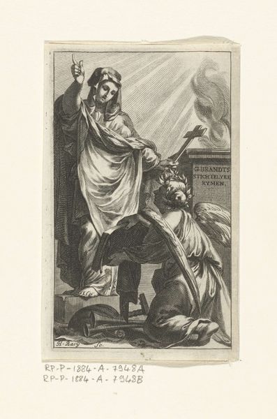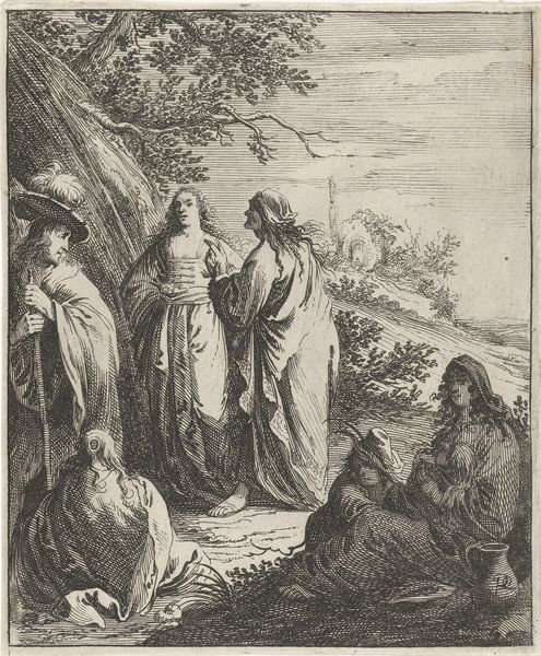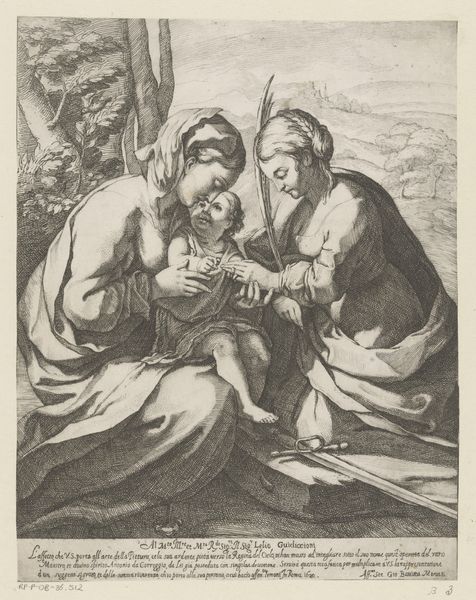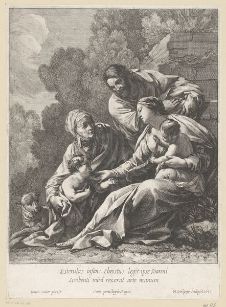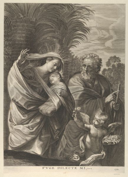Curator: Here we have "Vlucht naar Egypte," or "The Flight into Egypt," a print made between 1627 and 1655. Samuel Bernard is credited with the engraving after a composition by Guido Reni. Editor: It has a somber tone, doesn't it? The stark lines of the engraving create a sense of gravity and urgency. The figures are set against a landscape, yet the landscape feels almost secondary, a stage for the drama unfolding. Curator: Precisely. This piece offers us insight into the political and religious turmoil of the era, reflecting the vulnerable position of the Holy Family as refugees fleeing persecution. The journey to Egypt embodies themes of exile and resilience in the face of political violence, a situation relevant across many cultures and centuries. Editor: Looking at the composition, I see the formal arrangement contributes to that feeling of vulnerability. The figures of Mary, Joseph, and the infant Jesus are huddled together, but they are placed rather starkly, nearly centrally, in the picture plane. See how that draws our eyes to their faces, but with those strong contrasting lines we're left with the rawness of their emotions? Curator: Yes, and understanding Bernard’s social positioning as a printmaker is crucial. As the original painting would have been made for the wealthy, this print allowed the story and sentiment to reach a wider, possibly less literate audience. We can speculate about what feelings it stirred within them at that time. Editor: Notice how Bernard masterfully used line work to create depth and texture, guiding our gaze. The contrasting lines forming the foliage versus the almost sculptural folds of Mary's garment—it’s a study in contrasts that highlight the importance of light in baroque sensibilities. Curator: These visual elements are carefully selected and placed, drawing parallels to the personal, political and religious challenges many were experiencing, encouraging empathy through representation. Editor: I agree, understanding these compositional techniques is pivotal to appreciate the depth of meaning Bernard imbued within his work. Curator: Ultimately, “Flight into Egypt” serves as a reminder of art's capacity to engage with universal themes of displacement, faith, and familial love throughout history. Editor: An effective demonstration of art making across time, demonstrating, above all, the universal appeal and durability of masterful composition and attention to form.