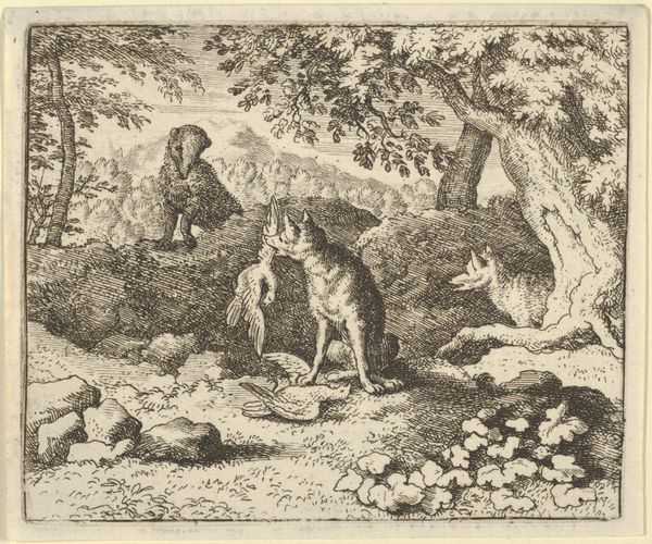 Allart van Everdingen made this print, "On Order of the Lion," likely in the mid-17th century, illustrating an episode from the popular medieval fable "Reynard the Fox." The image depicts a crude form of justice being meted out in the animal kingdom, a thinly veiled allegory for the social hierarchies of Everdingen’s time. Made in the Netherlands, the print reflects the period’s fascination with moralizing tales, often used to critique the powerful. Note how the artist uses the animal figures to satirize human behavior, with the fox embodying cunning and the lion representing authority. The presence of a castle in the background suggests the physical and institutional structures that uphold this social order. Understanding this print requires us to consider the social and political climate of the Dutch Golden Age, a period marked by both prosperity and stark social inequalities. Through careful analysis of such visual and literary sources, we can uncover the complex interplay between art, power, and social critique.
