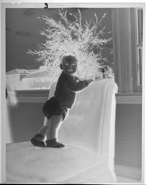Editor: This is an intriguing, undated photograph by Lucian and Mary Brown, titled "Untitled (baby girl on couch, window in background)." It's a small, silvery print, and the inverted tones give it an eerie feel. What do you see in this piece? Curator: The composition is remarkable. The juxtaposition of the doll, seemingly alive, against the backdrop of the stark, bare trees outside the window creates a fascinating tension. The negative space also has a large impact, with the stark whiteness of the image providing a haunting effect. Editor: I hadn't considered the negative space before. I was too focused on the doll itself. Thanks for pointing that out! Curator: Precisely. It is through the interplay of these formal elements that the photograph achieves its unsettling power. Editor: I understand now how the formal elements contribute to the overall mood. Thanks for your insights!