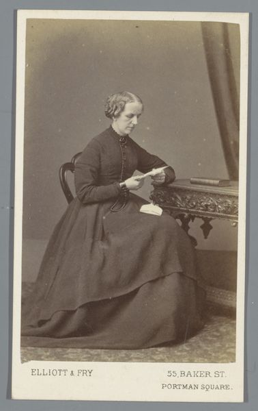 Editor: So, here we have Auguste Letalle’s “Portrait of an Unknown Woman Reading,” dating from between 1858 and 1880, done with photography. I’m struck by the quiet intimacy, and also how posed it seems. It's interesting to see this genre painting captured in a photograph. What stands out to you in terms of its historical and cultural significance? Curator: It’s precisely that tension between intimacy and artifice that I find compelling. Photography was relatively new then. Consider the context: how does this image play into ideas of female virtue and intellectual pursuit circulating at the time? Were these images used as calling cards, offering a certain aspirational vision? Editor: That makes sense! The staging does feel deliberate. Maybe it's trying to project a certain image, almost like early "influencer" content, in a way. Curator: Exactly! And how does that ornate chair – which is a definite status symbol – and her clothing choices affect how we read the subject’s socio-economic status? Or her very *access* to education? Were these details meant to broadcast something to viewers? Editor: Right, I hadn’t thought about access in those terms! Now that you mention it, it highlights this strange intersection of personal identity and public performance... a negotiation I hadn’t really considered within photographic portraiture. Curator: Precisely. It prompts us to look beyond the surface and ask questions about the cultural forces at play in image making and reception. Thinking about these issues reframes a seemingly straightforward portrait into something much more multifaceted, wouldn’t you say? Editor: Definitely! It’s made me think more deeply about how social structures were influencing even the seemingly private act of reading and being photographed. Thanks!