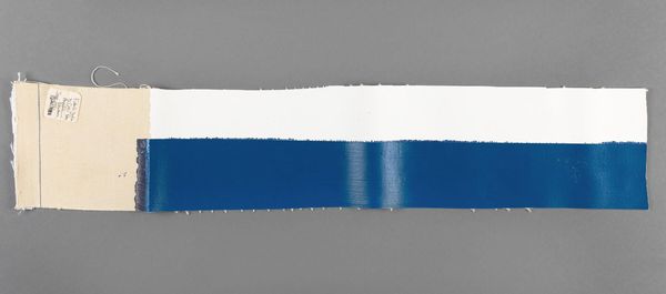 Curator: Yves Gaucher’s "Signal," executed in 1991 with acrylic paint, offers a stark yet compelling study in minimalist composition. Editor: Wow, talk about visual haiku! That simple band of color feels intensely focused, like a horizon line in a dream. The stark contrast against the white is pretty dramatic. Curator: Precisely. Note the meticulous arrangement: The interplay of cool grays bookending the deep navy and stark black sections creates a calculated balance. It prompts considerations on how color defines space. Editor: It almost feels like the painting is saying, "less is absolutely more, baby!". I dig how those blacks and grays create depth despite their flatness, as if it’s not about representation, but almost a feeling of matter, light, and nothingness coexisting. Is that what he was going for? Curator: Gaucher was deeply involved with color-field painting and geometric abstraction, exploring how basic shapes and blocks of color communicate fundamental ideas, stripped of extraneous detail. Editor: Like a visual telegraph! I mean the work's titled “Signal," so clearly communication— or at least the idea of a stark message—was key here. Makes you think, doesn't it? What are *we* transmitting with our own lives? Woah. Curator: Interesting interpretation. However, my reading also focuses on his application of modernism through clean lines, balanced shapes, and how those hues are distributed so as to provoke pure optical perception. Editor: Well, you can analyze it; I'll just keep getting vibes. The quiet confidence in Gaucher's hand... his capacity to say volumes using silence, color, and line. I dig it a lot. Curator: Indeed, its elegant austerity provides ample fodder for reflection and critical contemplation. A strong synthesis to conclude our encounter with this signal in color.