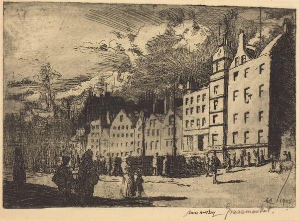 David Young Cameron made this etching, "Sugar Sample Room (Glasgow)", using precise lines and subtle shading, and it captures a scene that balances architectural grandeur with everyday life. The composition is structured around the imposing building, its facade rendered with meticulous detail. Cameron uses perspective to draw the viewer's eye along the street, where the play of light and shadow creates depth and texture. The contrast between the solid, geometric form of the building and the more freely sketched figures adds a dynamic tension. This interplay between structure and spontaneity reflects the artist's engagement with the formal qualities of etching. Cameron presents a world of encoded signs, inviting the viewer to decode the relationships between form, content, and context. This work is not just a visual record but an exploration of how the artist uses technique to mediate our understanding of urban space and social life.