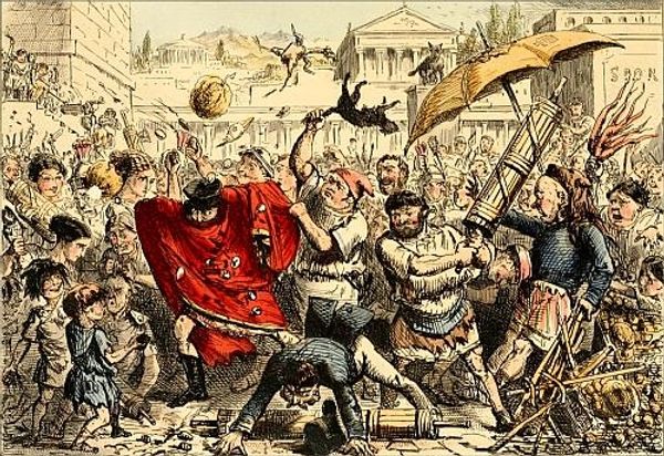 John Leech created this drawing, "Flaminius Restoring Liberty to Greece at the Isthmian Games," using pen and ink, resulting in an animated and exuberant scene filled with intricate details. The composition is dense, with figures packed tightly together, creating a sense of chaotic celebration. The lines are sharp and the hatching defines form and shadow. Leech cleverly uses historical costuming to destabilize conventional notions of representation. The figures are clad in a mix of classical Roman and Greek attire, set against a contemporary backdrop. The drawing’s structure invites us to question how images convey messages, suggesting that meaning is not fixed but negotiated through visual and cultural contexts. Leech's drawing invites ongoing interpretation by highlighting the complexities of visual communication, ensuring that its message remains dynamic and relevant.