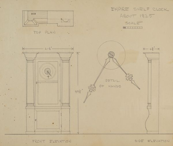 Curator: Lawrence Phillips gifts us this drawing from around 1936. Crafted in pencil on paper, it’s titled simply "Clock." What’s your first reaction? Editor: It feels like a ghost, or maybe an architectural premonition. There's something delicate and hopeful in its simplicity. Curator: It's essentially a blueprint of a Terry shelf clock from the early 19th century, meticulous in its top, front, and side elevations. There is also a scaled detail of the hands, as precise and balanced in shape as if ready to turn on its axis any second. Phillips obviously admires it. Editor: Blueprints, especially of time-keeping devices, are fascinating relics. In their geometric shapes, the drawing echoes larger themes around capitalism and industrial time. How it imposes structure on the domestic, everyday life. Curator: Absolutely. The formal symmetry feels so assured and permanent but drawn on paper in pencil, we are also witnessing it as transient—like a sketch fading slowly or eroding off a building’s blueprint. Editor: What I love is this clock feels deeply rooted in domesticity with the embellishment, flourishes, and finials—there's something subtly revolutionary about placing it on the same plane as architectural design. Almost arguing for their cultural and aesthetic significance. Curator: Well, there is a charming contrast. Phillips gives space on the paper to all of the details, the finials, feet, the decorative hands; so important to note in an otherwise functional design, especially as it exists within the home. I keep imagining this clock perched on a shelf, patiently ticking away. Editor: It invites us to question time's control, no? What narratives do these kinds of drawings have the potential to reveal beyond the artistic value? What of the lives regulated by them and what temporal rhythms are resisted. Curator: I suppose Phillips encourages a look at domestic design from different perspectives, offering its value beyond something to be efficiently manufactured and simply owned. Editor: Precisely! A re-imagining, offering a perspective shift about our place with design, and even our relationship to time itself.