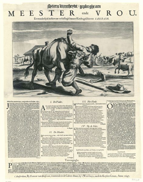 Curator: Let's delve into this intriguing print, "Allegorie op de Noordse oorlog, 1700," or "Allegory of the Great Northern War, 1700" by Pieter van den Berge, housed at the Rijksmuseum. It's an engraving that dates back to a very turbulent time in European history. Editor: My first impression is chaos. A menagerie of creatures caught in conflict – lions, horses, an elephant, even eagles overhead. It’s quite densely packed, giving it a sense of immediate turmoil. Curator: Exactly. It’s a fascinating example of Baroque allegory, using symbolic figures to comment on the complex political landscape of the Great Northern War. The various animals likely represent the different powers involved in the conflict, with their struggles embodying the larger power dynamics at play. Understanding these allegories gives insight into the sociopolitical moment. Editor: It makes sense now that you point that out. Is it fair to say the elephant must symbolize one of the major powers then? How were viewers supposed to decipher such elaborate visual metaphor? I'd imagine a very select group of informed viewers at the time might fully grasp the intended message. Curator: Definitely a specific audience, familiar with the conventions of political allegory. Prints like these weren't just about disseminating information, but about shaping public opinion and constructing a particular narrative around the war. Think of how imagery gets used today by powerful influencers with large communities. Editor: So, it's a work designed to provoke particular thought among viewers, potentially manipulating opinion. It has strong contemporary resonances. Seeing that soldier attacking the elephant seems particularly charged, given historical and post-colonial interpretations we have today, regarding the symbolic treatment of nations and peoples in artwork. I wonder if the average person, without our scholarly context, could feel and pick that up nonetheless, even unconsciously. Curator: A very relevant consideration; the complexities surrounding these visual histories. Editor: It leaves you reflecting on how wars, conflicts, and history are presented to us. It feels pertinent that the visual language used to discuss warfare even three centuries ago could echo with concerns of bias and constructed perception now.