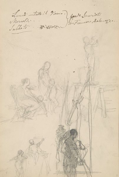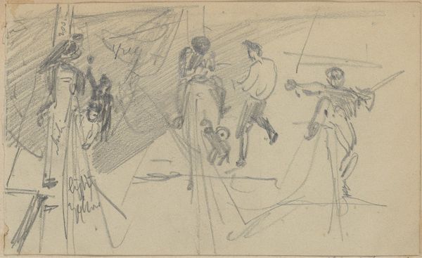 Editor: This drawing, titled 'J'ai Fait Sauter La Banque study', is by Théophile Alexandre Steinlen. It’s made with pencil. I find the image quite intriguing because the lines are loose and there's a dynamic sense of celebration but the sketch-like quality leaves so much unsaid. What do you see in this piece that sheds light on its cultural context? Curator: Well, viewing this through a historical lens, particularly considering Steinlen's social commentary, I see a vibrant snapshot of Parisian society at the turn of the century, likely connected to theatre and performance. The somewhat frantic energy in the image aligns with the burgeoning entertainment industry but what’s absent is perhaps more interesting. Editor: Absent? How so? Curator: Note the incomplete nature of the figures. Steinlen gives us impressions of the characters – the dapper gentleman in a top hat, the energetic dancer, the joyous revelers – but stops short of portraying them as individuals. I think this draws attention to social performance, asking us to consider how identity is often staged for public consumption. Does it strike you as genuine emotion, or is something more performative at play? Editor: That's a really interesting way to put it. I was just focused on the energy but you are right, the incomplete rendering really shifts it to more of a surface-level celebration. Curator: Exactly. He’s hinting at the social and political dimensions of entertainment; how it can serve as a distraction or even a carefully constructed narrative. Think about how posters and printed images became so central to public life at this time. Editor: So the act of "blowing up the bank," might be interpreted less literally and more symbolically about challenging established norms or expectations through theatre. I see a challenge to institutional power embedded within the fun of Parisian performance! Curator: Precisely! Thinking about the public role of art and its relation to socio-political shifts provides an intriguing perspective. Editor: I never would have considered that initial celebratory mood could be interpreted in that way! I'll be viewing all works with such dynamism through an entirely different lens now.