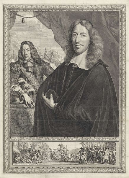Pieter de Jode II created this print, "Portret van Henricus Florent Laurin," using engraving. The portrait commemorates Henricus Florent Laurin, and was made in 1662 when Laurin was 43 years old. The elaborate framing, complete with allegorical figures, heraldry, and Latin inscriptions, speaks to Laurin's status. The figure on the left, adorned with musical instruments, is probably Apollo, who was the Greek God of music. It is set against the stern figure of a warrior on the right. The Latin phrases translate to express Laurin's rejection of deceit and superficiality. What interests me most here is the emotional tenor of the image. Laurin’s direct gaze and slightly furrowed brow suggest a man of intellect and seriousness. What does it mean to want to be remembered in this way? Ultimately, the portrait underscores how identity can be carefully crafted and curated through art, inviting us to reflect on the interplay between public image and personal truth.