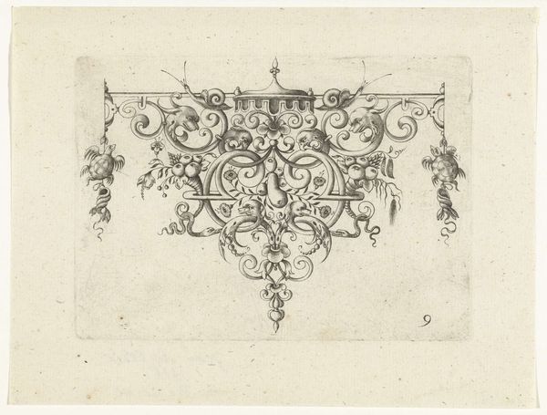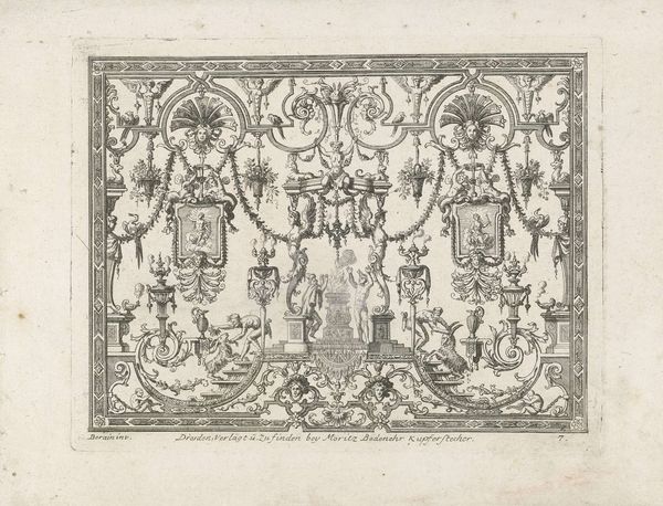 Moritz Bodenehr created this line engraving titled "Moderne grotesken met cherubijnen in bladerkransen," or "Modern Grotesques with Cherubs in Leaf Garlands," at an unknown date. The composition exhibits a patterned symmetry where classical motifs are playfully intertwined. Grotesque figures—part human, part decorative flourish—frame cherubs set within circular medallions. Notice the use of line: delicate yet precise, it animates the scene with a sense of rhythmic motion. Vines and decorative garlands cascade across the top, contrasting with the structured framework along the bottom edge. Bodenehr uses the grotesque style to destabilize the seriousness often associated with classical forms. By blending the human figure with abstract ornamentation, he challenges the viewer to reconsider fixed categories of beauty and meaning. This blending of forms anticipates later artistic movements that sought to disrupt traditional modes of representation. Ultimately, this print invites us to appreciate the fluidity of meaning in art, a space where classical ideals meet playful invention.