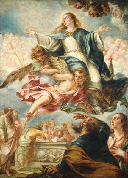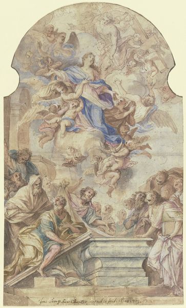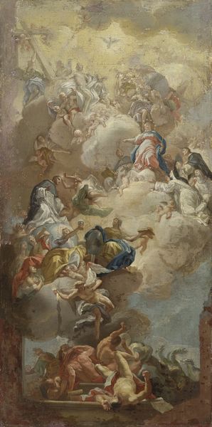 Editor: Here we have Peter Paul Rubens’ oil painting, “The Incarnation as Fulfillment of All the Prophecies." It's filled with figures ascending into the heavens. I’m struck by the contrast between the figures looking up at the top and the scholarly men on the steps, almost in earthly contrast. What do you see in this piece? Curator: For me, this painting isn't simply a depiction of a religious scene, it’s a powerful assertion of institutional authority in a period of great social and religious upheaval. Notice how the Virgin Mary is elevated, almost enthroned. Think about the Counter-Reformation context, where the Catholic Church was actively combating the rise of Protestantism. Can you see how Rubens is visually reinforcing the Church's doctrines through this glorification? Editor: I hadn't thought about the painting as an assertion of authority. It’s interesting to consider the role of art as propaganda or, at least, persuasive rhetoric. Are the male scholars symbols of continuity? Curator: Exactly. They’re representative of theological tradition, positioned as witnesses to and intellectual upholders of the incarnation. Now, consider the figures at the top. God is flanked by female allegorical figures, but what’s striking about them? Editor: Well, they both look quite powerful in their positions and their placement gives them importance. Curator: Absolutely, their inclusion provides an interesting perspective to historical female power structures, albeit indirectly. It raises questions about gender and agency within religious and artistic representations. Thinking critically about who is included, who is excluded, and how they are depicted, is key to understanding the complex power dynamics at play. Editor: This has completely changed how I view Rubens' work. I see the painting through the lens of power, gender and religious history. Curator: And that is exactly what context enables us to do - unearth the layers of meaning that reside beneath the surface!