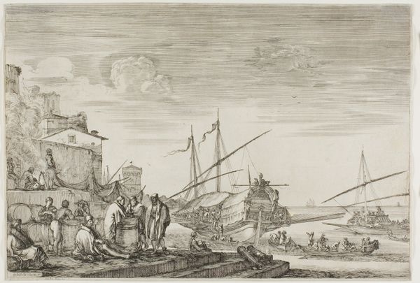 This print, of two galleys in the harbor of Livorno, was made by an anonymous artist. It is an etching, meaning that the image was incised into a metal plate, probably copper, with a sharp needle. The process of etching gives the image a distinctive graphic quality, with fine lines defining the forms and creating a sense of depth. Look closely and you will see how the varying thickness and density of the lines create areas of light and shadow, bringing the scene to life. This print is not just a picture of a harbor, but also a document of social life. The galleys themselves were complex machines, requiring skilled labor to build and maintain. The harbor would have been a bustling center of commerce and exchange, with sailors, merchants, and laborers all playing a role in the movement of goods and people. By focusing on the material processes and social context of this print, we can gain a deeper understanding of the world in which it was created.