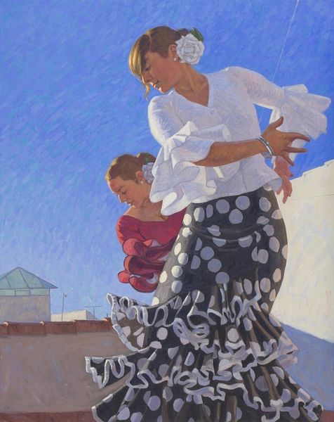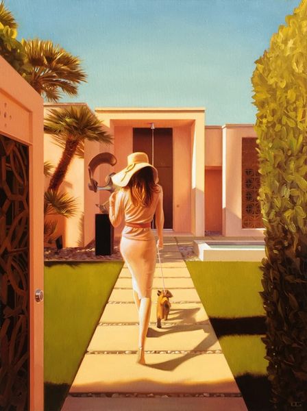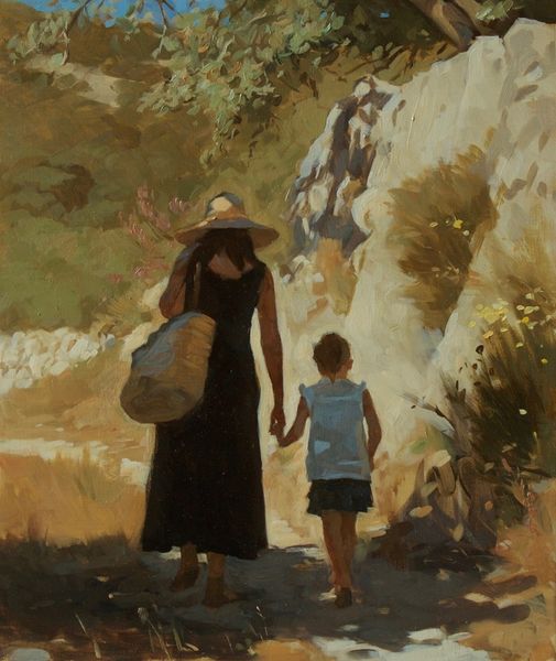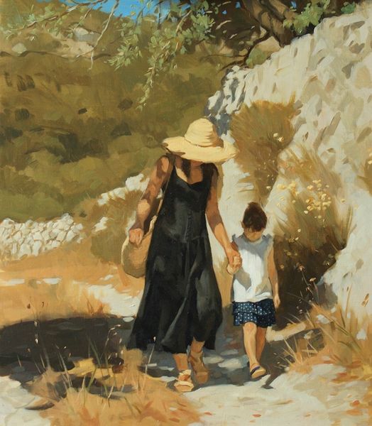 Zoe Hawk made this painting, Moving Under Skies, with what looks like thin washes of oil, which gives it this dreamy, hazy kind of feeling. It reminds me of making art as a kid, how you layer colours and the way you approach it, without overthinking. The painting’s got a very smooth surface, almost like a fresco, which makes the figures stand out. See how the one girl is leaning against that peachy wall? The flat colour makes her dress pop, like it's a collage. And the way the green bush spills over the wall, all rough and textured, it’s like a different world crashing into this calm scene. There’s something really beautiful in the way it balances stillness with hidden stories. It’s like a Edward Hopper painting, but maybe if he had a soft spot for children and magical realism.