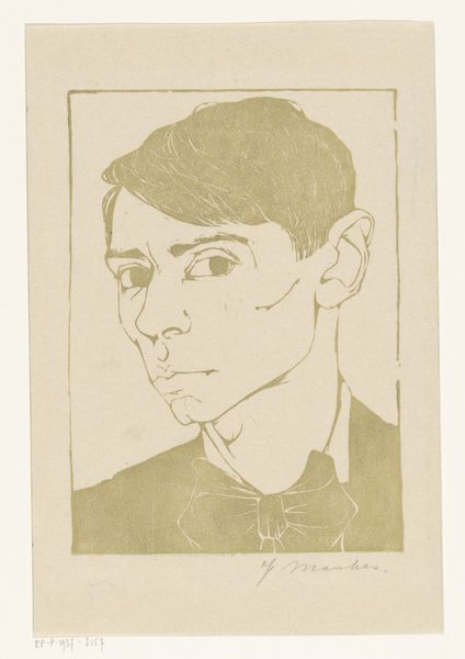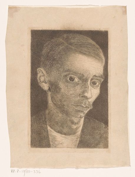 Editor: This is Jan Mankes' "Self-Portrait," created in 1915 using pencil. The expression in his eyes is intense, almost piercing. I'm curious, what kind of story do you think this portrait tells? Curator: Well, considering Mankes' artistic context, it's worth thinking about how his work fits into the broader societal shifts happening at that time. Early 20th century portraiture was really beginning to challenge traditional representations of self. You have the rise of psychology and a deeper exploration of inner life. Do you see elements of that reflected in the portrait’s direct gaze and stark composition? Editor: I see what you mean, it's more than just a likeness, there is definitely a psychological weight to it. It seems like he is inviting the viewer to connect. How would his contemporary audience receive his invitation? Curator: That's interesting! How it would be received really depends. At the time, realism was gaining popularity but wasn’t entirely devoid of academic expectations. There's an undeniable intimacy here, an unvarnished quality that might resonate with some while perhaps seeming unsettling to others accustomed to more idealized portrayals. This piece seems to democratize self portraiture, by allowing the every-man a chance at contemplation. Editor: So, its power really lies in the social context of the time, where the established way of thinking of portraits was challenged by this approach that favors psychological reading. Curator: Precisely! It serves as a time capsule of evolving perceptions of self and societal introspection. It invites us to consider how we project ourselves. Editor: I never thought about it that way. Thanks for contextualizing Mankes' self-portrait within those socio-cultural dialogues. Curator: My pleasure. Artworks really come alive when we see them within their time.