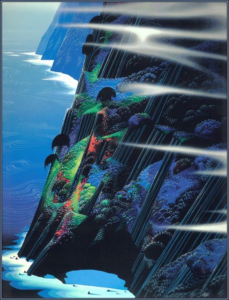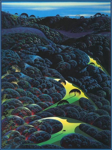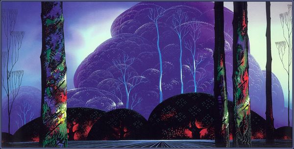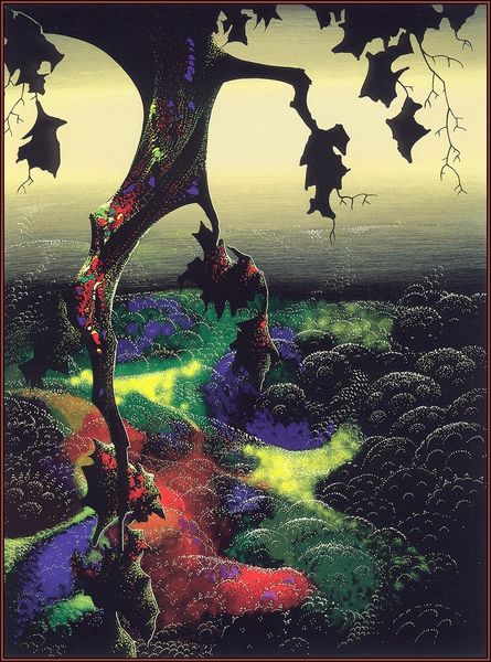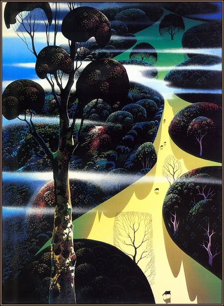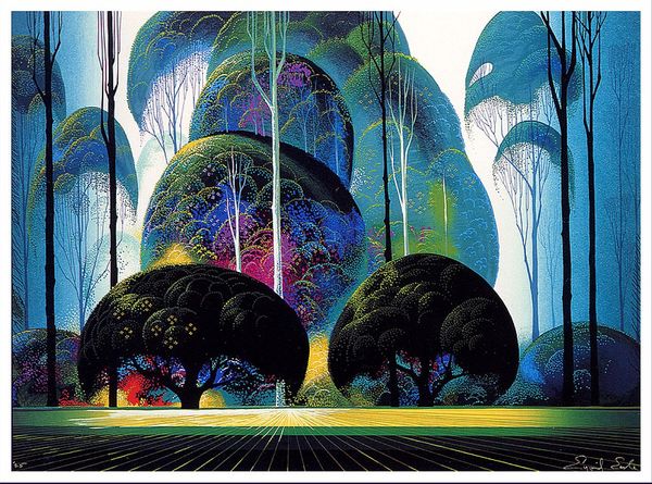Eyvind Earle made this scene, Blue Nocturne, most likely with tempera or gouache. The marks are so controlled and smooth, it looks airbrushed, but I don’t think it is. The color harmony is tight, almost monochromatic, a kind of fairytale, and the shapes are rounded, with a graphic feeling. The whole image sits on the surface with an interesting combination of depth and flatness. The big tree on the right, in particular, is a trip. Look closely at how Earle renders it. There are bands of greens and reds in its bark that swirl around the trunk and it's as if he's mapping some strange topography onto the tree itself. Earle worked for Disney for a while, and I guess you can see it. The precision and rendering is intense, like Magritte. The realness of color and the impossible coming together – it's all there. It's not so cool, and that's cool with me.