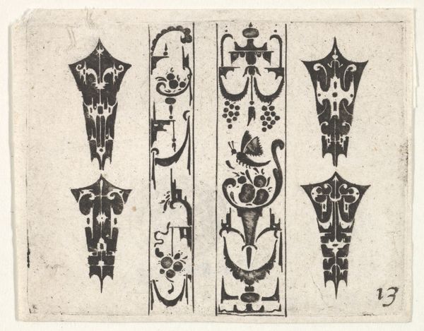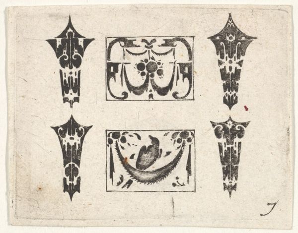 Curator: The first impression is striking—a composition of such graphic intensity. The black ink against the off-white paper creates a very high contrast. Editor: Here we have an engraving by Claes Jansz. Visscher, dating from 1600 to 1620, entitled "Blackwork Print with a Symmetrical Schweifwerk Pattern." It's currently housed at the Metropolitan Museum of Art. It immediately strikes me as emblematic of its era, reflecting a world steeped in social and political upheaval. Curator: I see how this piece would speak to its time, it’s full of recurring motifs. The shapes are very geometric and decorative, what kind of political context do you see surfacing? Editor: This work speaks volumes about the fashion of the Northern Renaissance— the status and trade networks established when an elite desired objects which represented global connections, wealth and religious authority. I note in particular that blackwork, with its Iberian influences, came to England with Catherine of Aragon and instantly signaled power through fashion. This then trickled down through classes as pattern designs and woodcuts became available. Curator: That’s quite interesting and a lot to glean from an image made purely with black ink on paper. For me, there's a precision here in its execution. Note the intricate patterns in those almost symmetrical objects with their curvaceous and sharply pointed features. There’s a structural element with how all the geometric shapes interact, how each individual design in the rectangle has its own sense of symmetry within the frame. I love that, I wonder, could we dive into some potential symbology present? What story might that bird represent? Editor: Well, birds, particularly crows and ravens, in that era were often seen as ominous figures, or associated with pagan rituals and beliefs which were frowned upon. The bird surrounded by lush florals is quite symbolic, too—perhaps alluding to hidden freedoms among social constraint? I find that interesting and fitting for a print made in the midst of emerging European colonial efforts. Curator: Yes! Absolutely. Thanks to its graphic impact and cultural relevancy, it clearly reveals the complexities of its time. Editor: Agreed; the print offers valuable insights into the aesthetic values and shifting geopolitical climate.