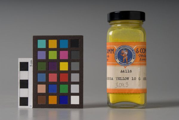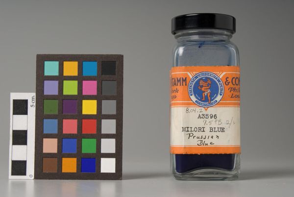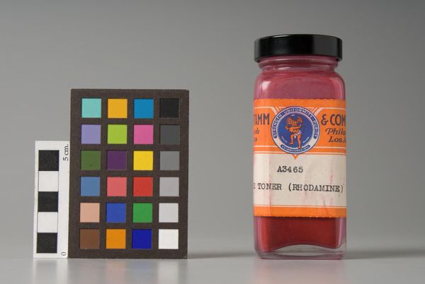 Editor: This is "Magenta Toner (Rhodamine)" by H. Kohnstamm & Co. It feels like a photograph of industrial materials. What do you see in this piece? Curator: Note the composition. The image arranges a color calibration chart next to a jar of magenta pigment. The contrast between the ordered grid and the contained powder creates a visual tension. Consider also the industrial aesthetic, devoid of overt artistic intention. Editor: I see it now! The tension between order and chaos. Curator: Precisely. This piece exemplifies how the mundane, when framed with careful attention to form, can reveal unexpected aesthetic qualities. Editor: I hadn't considered that. Thanks for pointing out these qualities in the piece. Curator: It’s a reminder that even the most functional objects possess inherent visual interest, if viewed with a discerning eye.