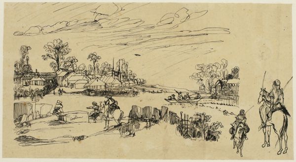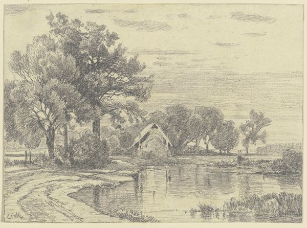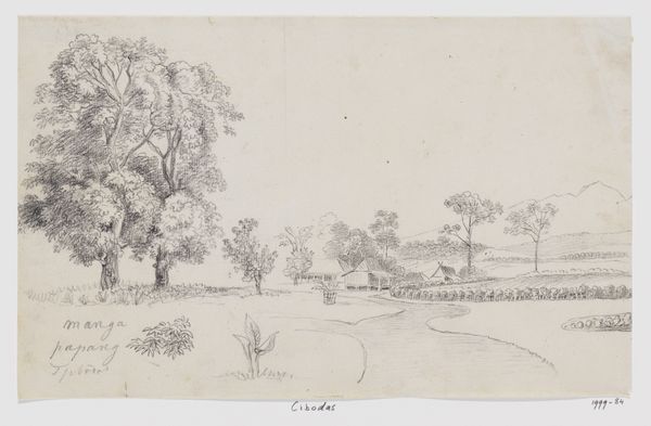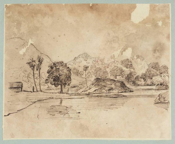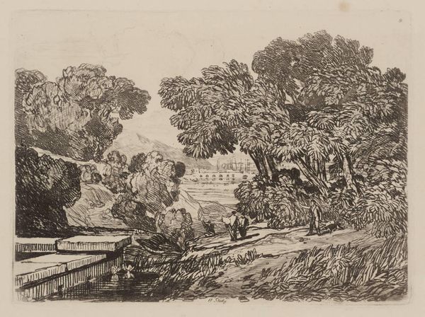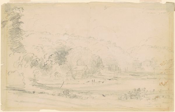 Editor: Here we have Franz Kobell's "Trees," a drawing rendered in ink, chalk and frottage. I'm immediately struck by the contrast between the delicate, almost ephemeral, rendering of the foliage and the more rigid architectural forms nestled within. What do you see in this piece? Curator: Well, from a formalist perspective, the beauty resides in the interplay of lines and the carefully orchestrated tonal variations. Notice how Kobell uses hatching and cross-hatching to define form and create depth. Observe how these techniques direct our eye from the darker foreground, through the textures of trees, to the softer forms further back in space, toward the building, implying its relative scale. Do you observe these patterns too? Editor: Yes, I see how the density of the lines creates a sense of volume, especially in the trees. But I am wondering why the building sits right on the horizion? Does that contribute to the artwork's formalist elements? Curator: Precisely. The architectural form acts as a compositional anchor, a point of visual stability amidst the organic chaos of the surrounding nature. Its presence is pivotal, acting as a critical design feature. Think about the impact if this architectural element was eliminated, it transforms into a landscape without a counter-focal point. Editor: So, without the building, the composition would risk appearing too diffuse, and its purpose lost on its intended audience? Curator: Indeed, it would lack a critical structural component necessary for engaging viewers. Consider that while our eyes and minds desire structure in any image, any elimination of such structure might simply disengage the intended viewership. What do you now make of this drawing in totality, keeping this conversation in mind? Editor: I now notice it's more intricate and intentionally balanced than I first realized. It is a deliberate composition that marries the organic and geometric to hold your interest. Thanks so much for guiding me! Curator: My pleasure. Close looking reveals endless formal subtleties. It's the structure itself that carries meaning, more so than any specific symbolic reading we might impose.