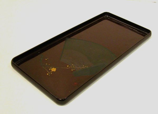 Curator: At the Metropolitan Museum, we’re looking at a striking yet humble object: a tray by Shibata Zeshin. Made between 1881 and 1889, its full title is "Tray with rice stalks and a grasshopper on a tea kettle," tempera and lacquer on wood. Editor: Oh, this is lovely! It feels both grounded and whimsical. The dark, almost brooding background really makes that burst of orange pop, like a miniature sunrise. And that golden, thread-like grasshopper... It's incredibly delicate. Curator: Yes, the darkness has layers. In the context of ukiyo-e traditions, dark grounds often represent a melancholic atmosphere, or even point toward transient worlds and "floating life". It is a sophisticated allusion, given the commonplace subject matter. Editor: It’s interesting you mention the feeling of transience, it gives the image a little more depth than you might expect. So we're dealing with mortality and the fleeting nature of things... all on a tea tray. Which, ironically, you’d think of as such a sturdy, everyday object. Curator: Precisely. Even the motifs tie into such feelings. Rice stalks, though representative of harvest and bounty, are very short lived. And grasshoppers? Traditionally, they symbolize autumn, another moment of ending. They remind the viewer to seize opportunity while it lasts. Editor: I love the almost naive depiction of the tea kettle, then, that burst of orange in the upper right is, on its own, kind of cheerful. Against the symbolic background of loss, the whole tableau strikes me as really dynamic: a celebration of small comforts amidst big concerns. The way the orange seems to glow feels particularly vital. Curator: Zeshin masterfully orchestrates the visual elements and their historical references, inviting viewers to interpret layers of meaning in what could be an everyday image. Editor: It reminds you that even daily life has deeper meaning—memento mori, and enjoy the small stuff while it's here. It's very much a kind of beautiful mindfulness practice in visual form. Well, now I’m off to make some tea.