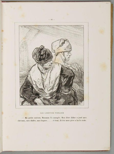 Editor: This print, "Come on! Madame Highness, just between us does Monsieur respect himself so much that he wouldn't give Madame a blow?" by Paul Gavarni, feels like a glimpse into a private, perhaps scandalous, conversation. How do you interpret the dynamics at play here? Curator: It's crucial to consider Gavarni's work within the context of 19th-century Parisian society. His prints often acted as social commentary, dissecting class dynamics and gender relations. The suggestive nature of the dialogue, coupled with the visual representation of these women, asks us to consider the limited power women held and how they navigated those spaces. Does the artist offer a critique or is he complicit in the objectification? Editor: That’s a powerful perspective. I hadn’t thought about the artist’s role in perpetuating or questioning these power imbalances. Curator: Exactly. And by engaging with these historical issues, we can begin to unpack the artwork's relevance to contemporary conversations about gender, power, and representation. Editor: I appreciate your help to contextualize the piece! Curator: My pleasure! It's vital to think about art as a reflection of its time and how it still speaks to us today.