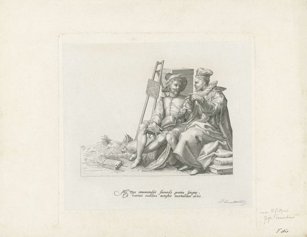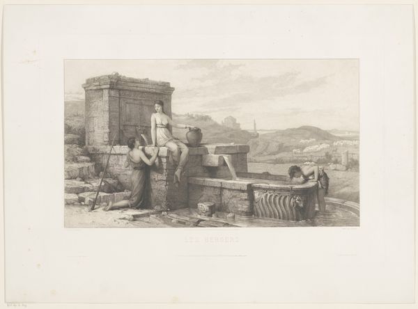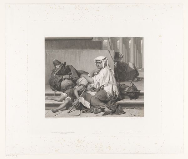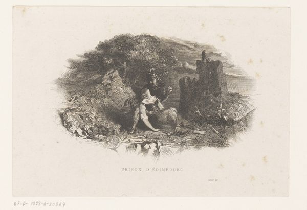 Abraham Lion Zeelander created this artwork titled "Man met jongen voor ruïne" using etching techniques. The composition is striking, defined by a stark contrast between the detailed foreground and the atmospheric ruin backdrop. The artist masterfully employs line work, varying its density to create depth and texture. Notice how the etched lines define form, particularly in the figures. The man and boy, are positioned in the foreground. A formal reading of the work suggests a contemplation of time and memory. The ruin serves not just as a setting but as a symbol. Considered through a semiotic lens, the ruin could represent the decay of old orders or systems. The figures in the foreground may symbolize humanity's continuous presence amidst such decline. Zeelander's use of form and the stark contrast between the figures and setting opens a dialogue about permanence, history, and the human condition. It stands as a powerful reflection of broader cultural and philosophical inquiries.
