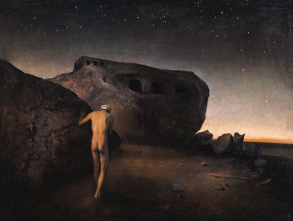 Editor: This is "The Black Cloud", an oil painting by Odd Nerdrum. The stark landscape and figures swathed in cloth create a really unsettling, almost post-apocalyptic feeling. What jumps out at you when you look at it? Curator: Well, it’s difficult to divorce Nerdrum's work from its reception and the critical discourse that surrounds him. He self-identifies as a "kitsch" painter, rejecting modernism, and embracing narrative, skill, and emotion in ways deemed unfashionable by many art institutions. So the painting becomes, in part, a political statement about what is valued in the art world, wouldn't you say? Editor: I see what you mean. It's like he's deliberately going against the grain. But how does that affect the way we understand the imagery itself, the black cloud and figures in the desolate landscape? Curator: Considering that history, we have to look at this with his stated intent in mind: rejecting abstraction, rejecting cynicism. What function could figures from the past in an invented landscape serve in communicating the angst of modern societies? Consider the symbolism. What stories, historical or mythical, might Nerdrum be drawing on here? And for what purpose? Editor: So you're saying it's not just about the surface aesthetic, but also a commentary on the role of art and the artist in society? A bit like Romanticism revived in the late 20th Century? Curator: Precisely. This work, like much of Nerdrum's oeuvre, is about challenging the status quo of the art world and broader social values. It reminds us to consider the values different aesthetics reinforce, as well as how individual choice can affect one's contribution. Editor: That's fascinating. I'd never really thought about his work that way. It makes you think about the politics of the art world in a new way. Curator: Absolutely, it allows for further contemplation and, dare I say, challenges pre-conceived notions regarding taste.